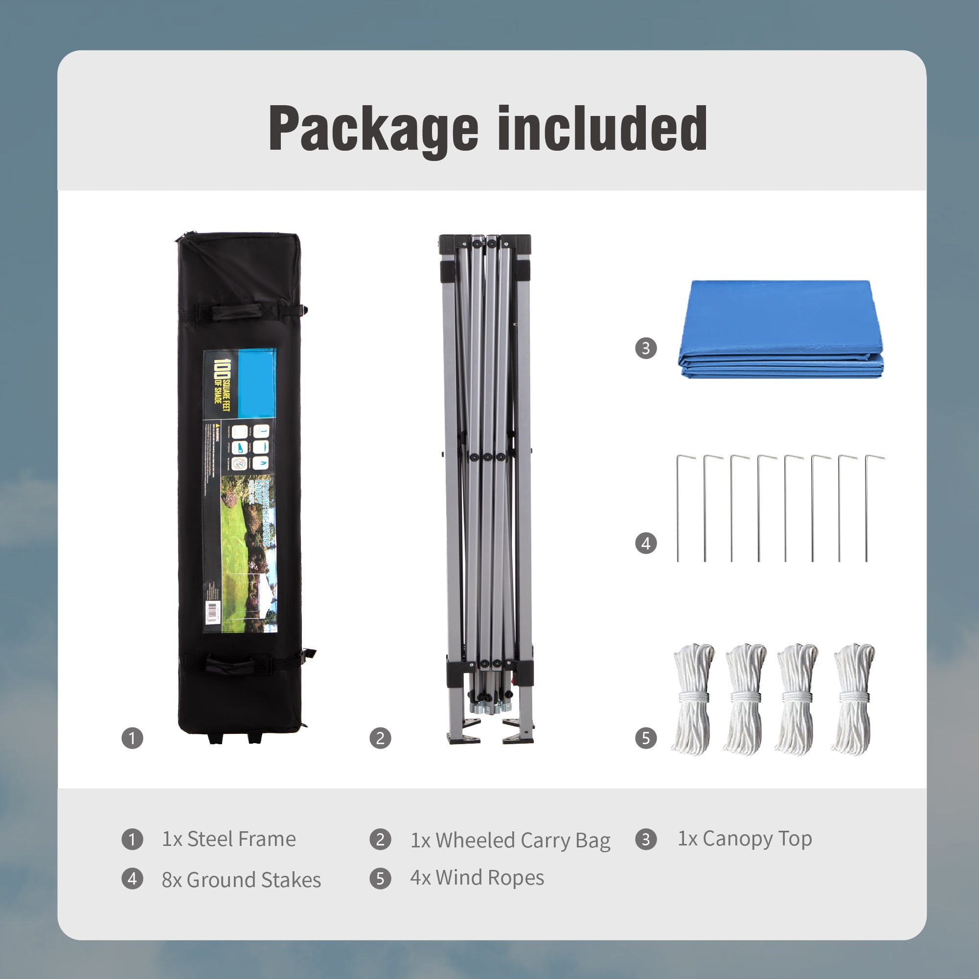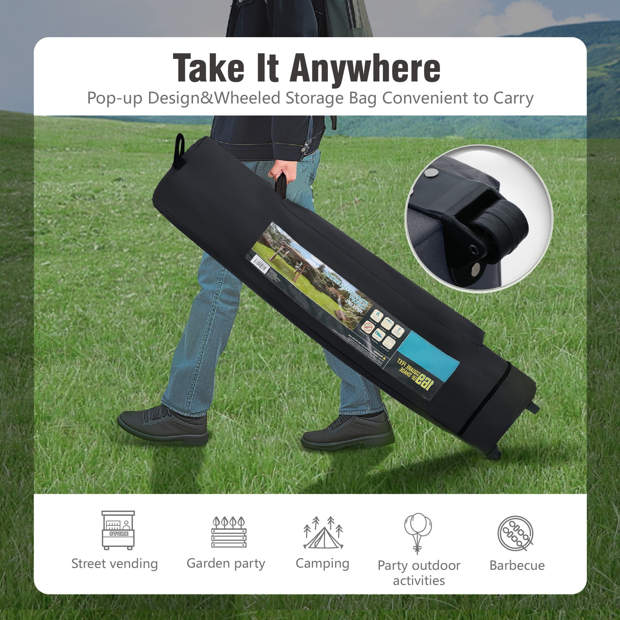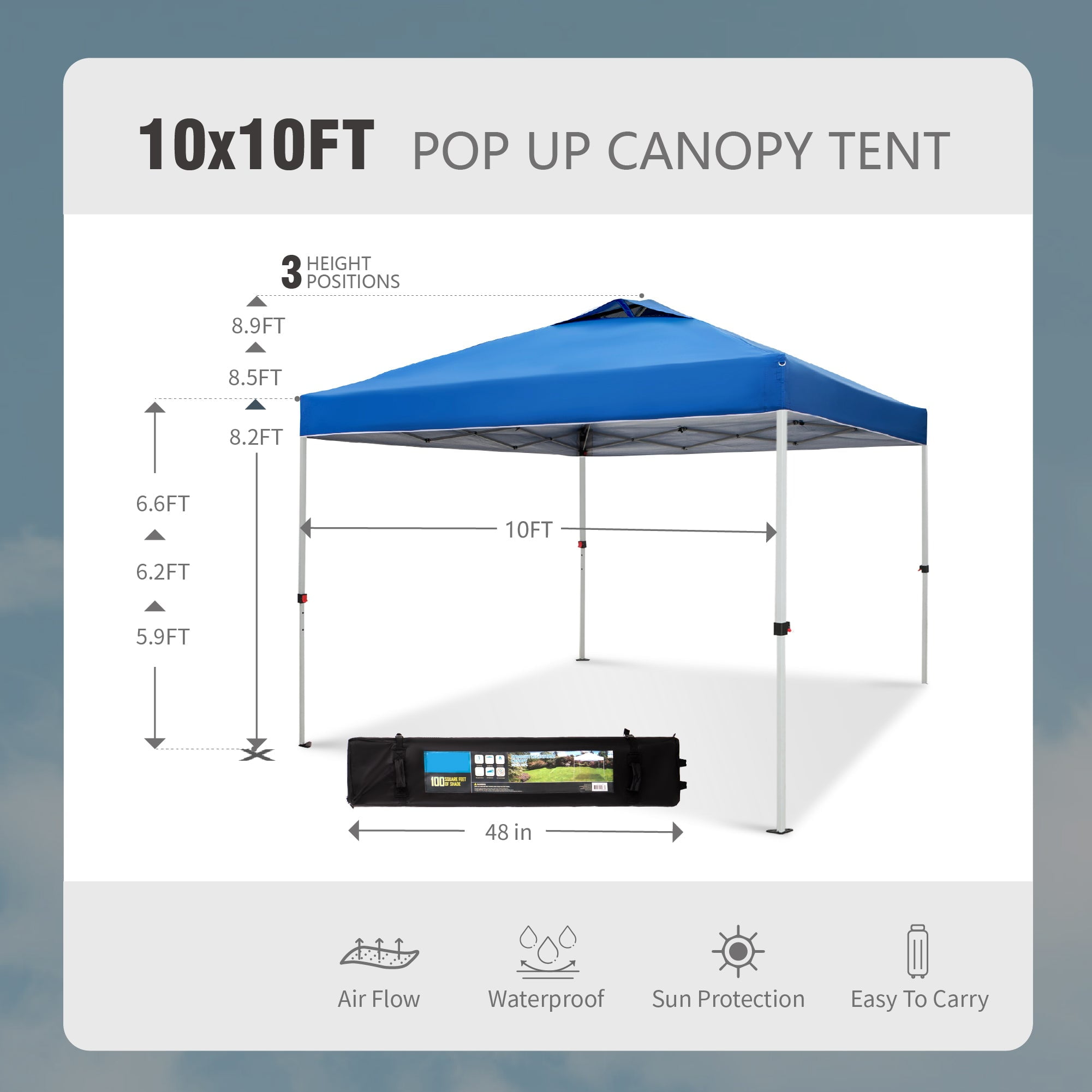 Features & Details High-Quality Construction: Crafted with a rust-resistant steel frame and water-repellent polyester fabric coated with PU, it offers up to 99% UV protection. The fabric is easy to clean and fade-resistant, reducing maintenance hassles. The frame is upgraded with 25% thicker materials, making it lightweight and compact for easy transport and storage, fitting most cars and suitcases. Adjustable Height: Customize the canopy’s height with ease. The assembled size is 10′ x 10′, and you can choose from three height positions to adapt to your surroundings. The red thumb press buttons simplify the height adjustment process. Spacious Shelter: Our 10ft pop-up canopy offers 100 square feet of shade, accommodating approximately 10-15 people. With three height options, the lowest setting provides a clearance of 70.8 inches from the ground to the eave’s bottom. Effortless Assembly: Setting up the canopy is a breeze. Follow three simple steps for tool-free installation. Unfold the pre-installed frame, attach the fabric, and extend the legs. It comes with guy lines and stakes that enhance stability, ensuring your tent remains sturdy even in windy or rainy conditions. The wheeled bag ensures portability, allowing you to take the canopy wherever you desire. Versatile Applications: Relax and enjoy a variety of outdoor activities, from small businesses and craft shows to tailgate parties, picnics, camping, BBQs, vendor stalls, flea markets, and outdoor sporting events. Package Content 1 x Pre-installed frame 1 x Canopy Top 1 x Wheeled Bag 8 x Stake 4 x Rope 1 x Instruction Manual