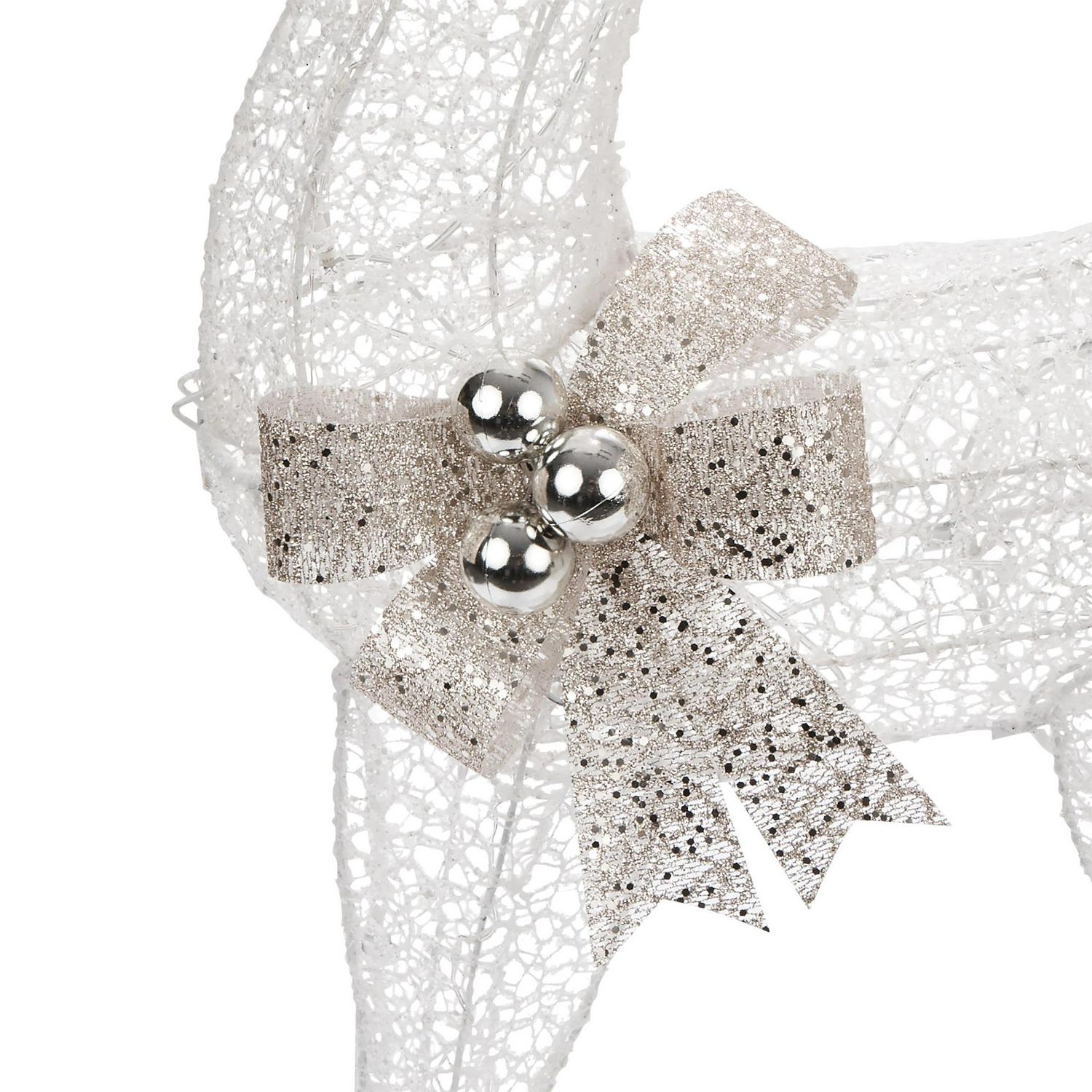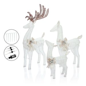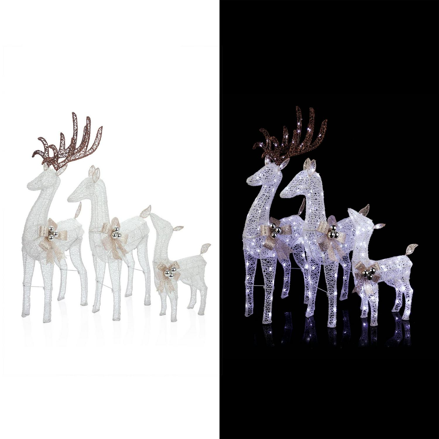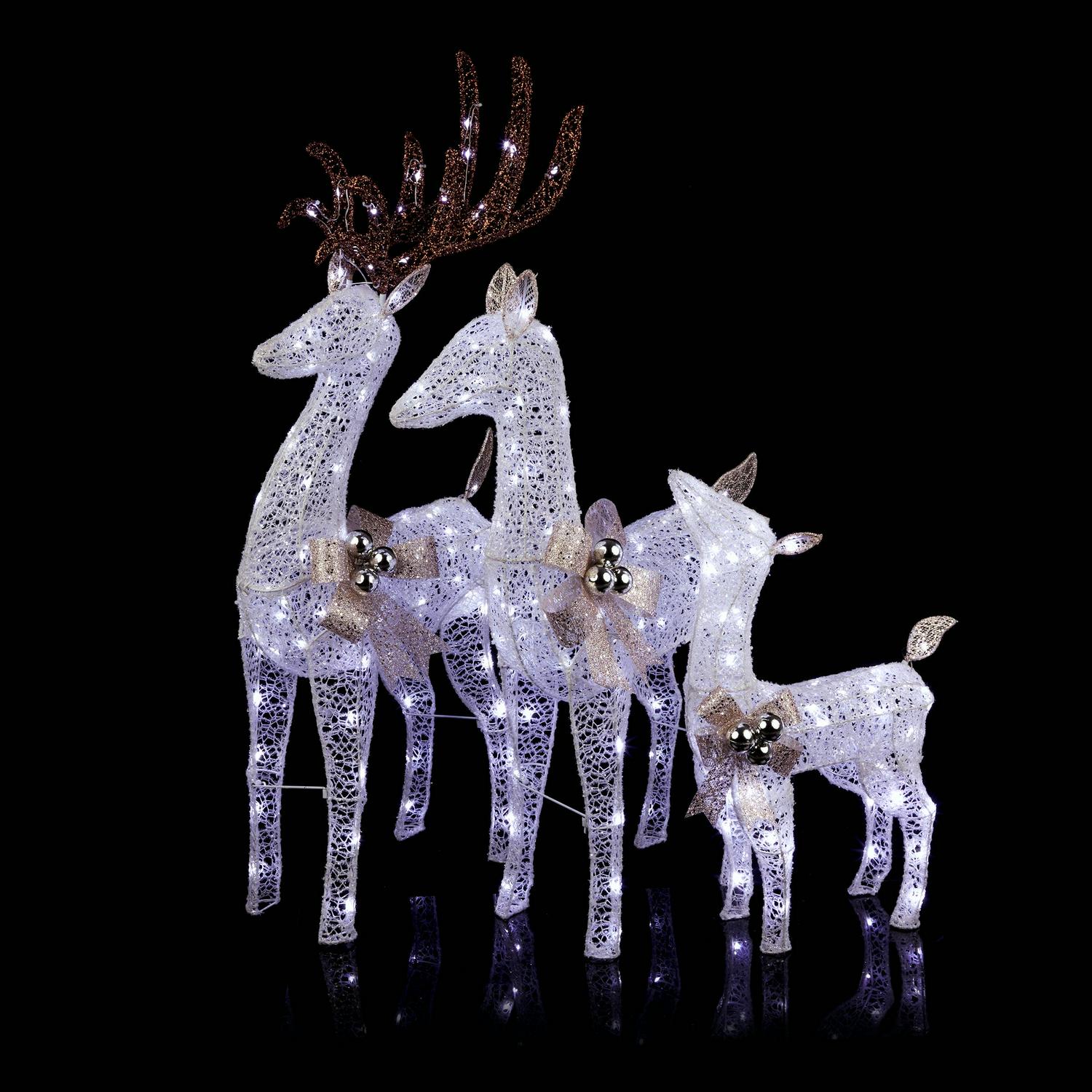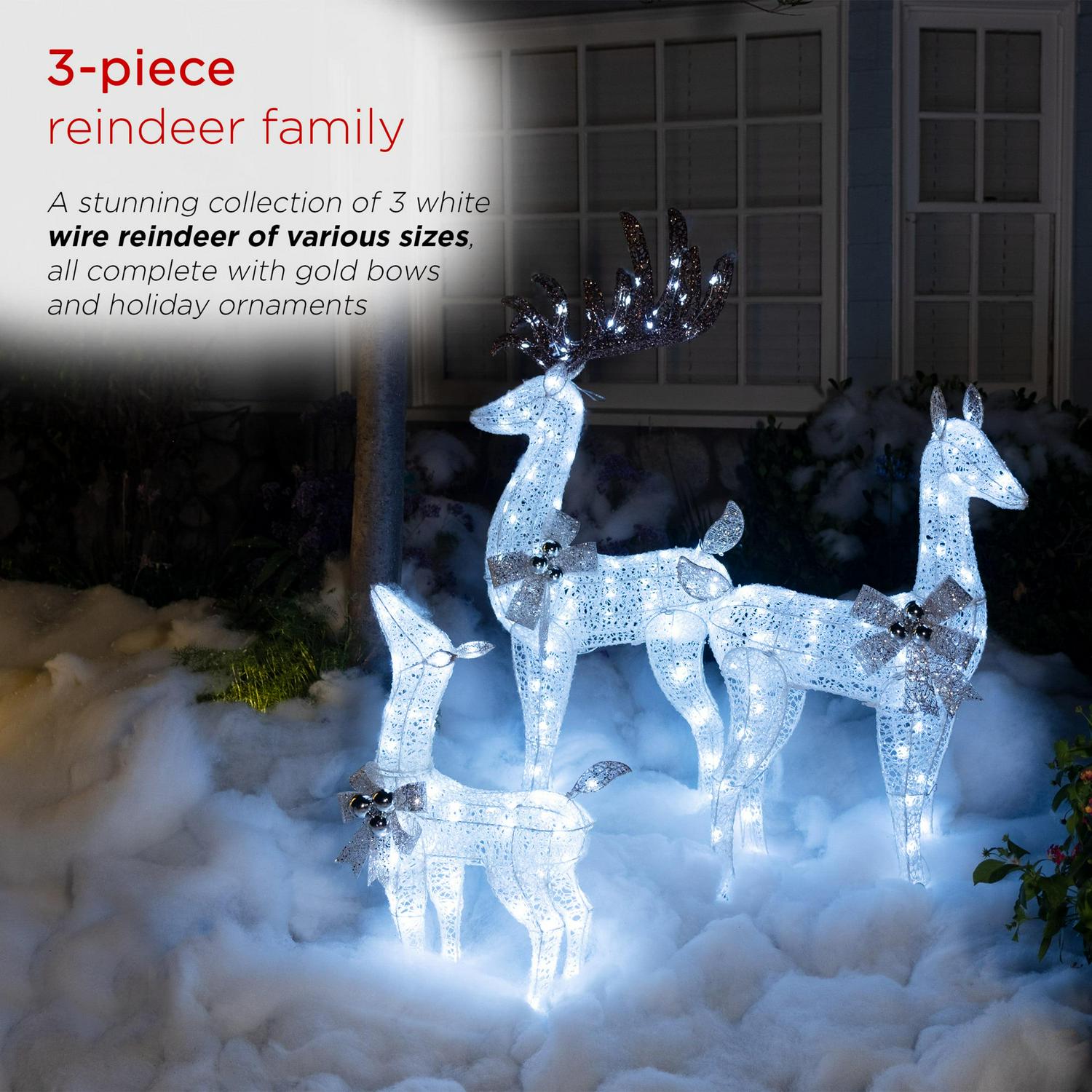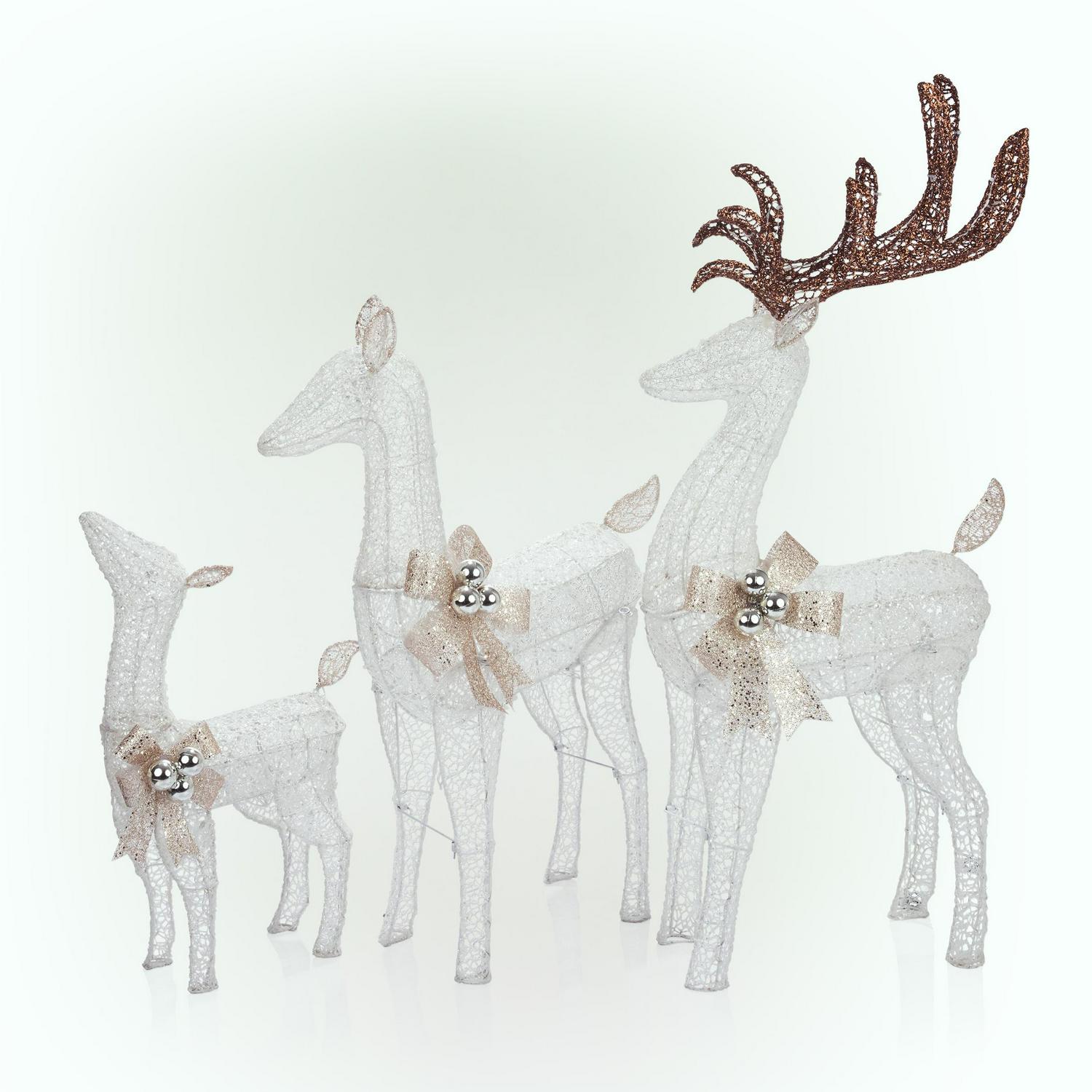 – 3-PIECE REINDEER FAMILY: A stunning collection of 3 white wire reindeer of various sizes, all complete with gold bows and holiday ornaments