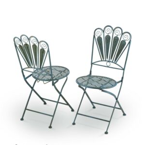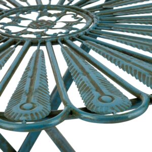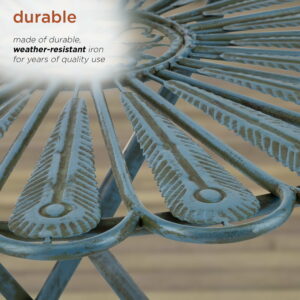Entertain your friends with the Alpine Corporation 3-Piece Rustic Peacock Feather Bistro Set. This beautiful blue outdoor furniture set adds a stylish and artful touch to your patio, porch or yard. You’ll be able to enjoy lovely summer days with your friends and family, sipping on lemonade or coffee while sitting at the round table with matching chairs. Made of durable, weather-resistant powder-coated steel, this set includes two folding chairs and one folding table – perfect for enjoying breakfast or lunch in your backyard for years to come. When winter comes around, this beautiful metal bistro set will fold to provide easy storage. With a 1-year warranty, you can be confident in the quality of your purchase. The Alpine Corporation Rustic Bistro Set measures 29″L x 29″W x 30″H for the table and chairs measure 16″L x 21″W x 36″H.