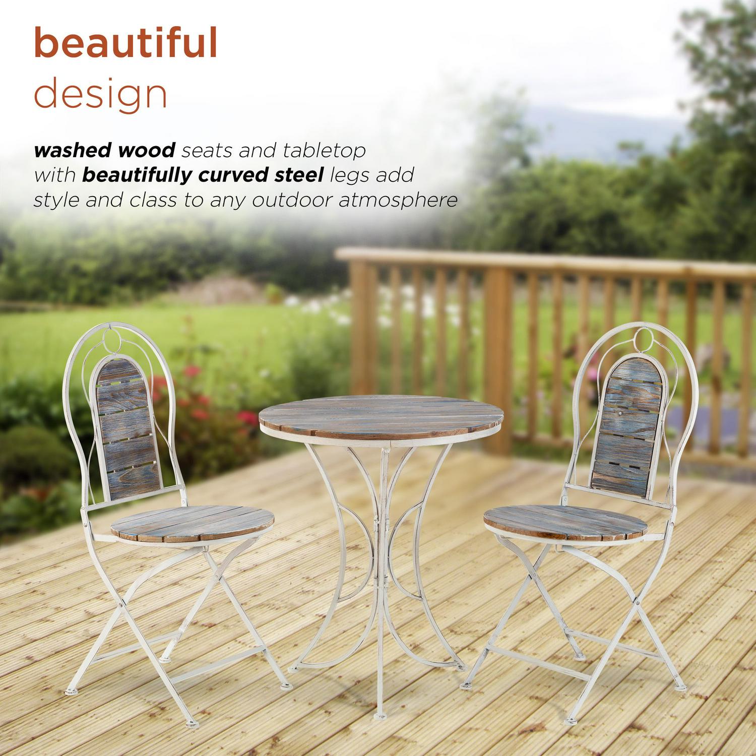 – BEAUTIFUL DESIGN: Washed wood seats and tabletop with beautifully curved steel legs add style and class to any outdoor atmosphere