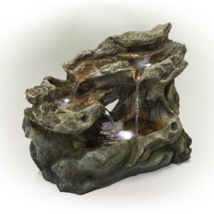 Enhance your indoor or outdoor living space with the Alpine Corporation Cascading Rainforest Tabletop Fountain. Functional and attractive, this multi-tier water fountain with a natural mossy aged stone look provides a tranquil, soothing, and elegant addition to any indoor or outdoor setting including living rooms, patios, offices, kitchens, gardens, entryways, bedrooms, and more. It features a gentle glow of 3 LED lights, and the soft, natural sounds of water cascading down the tiers creates a calm and relaxing atmosphere. For quick installation and easy operating, all necessary parts as well as a pump are included. Constructed from durable polystone, fiberglass, and plastic, this resilient fountain is weatherproof to offer years of quality use. The fountain measures 14″ x 8″ x 10″ for the perfect fit inside or outside your home.