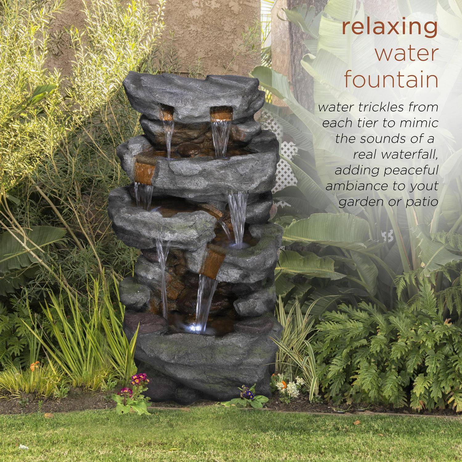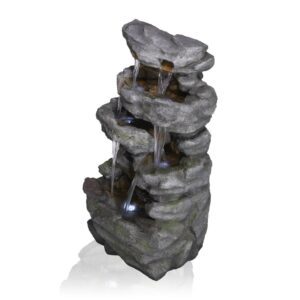 – Cascading stone wall fountain features 10 cool white LED lights, has a 16 liter capacity, and is the perfect addition to your outdoor décor