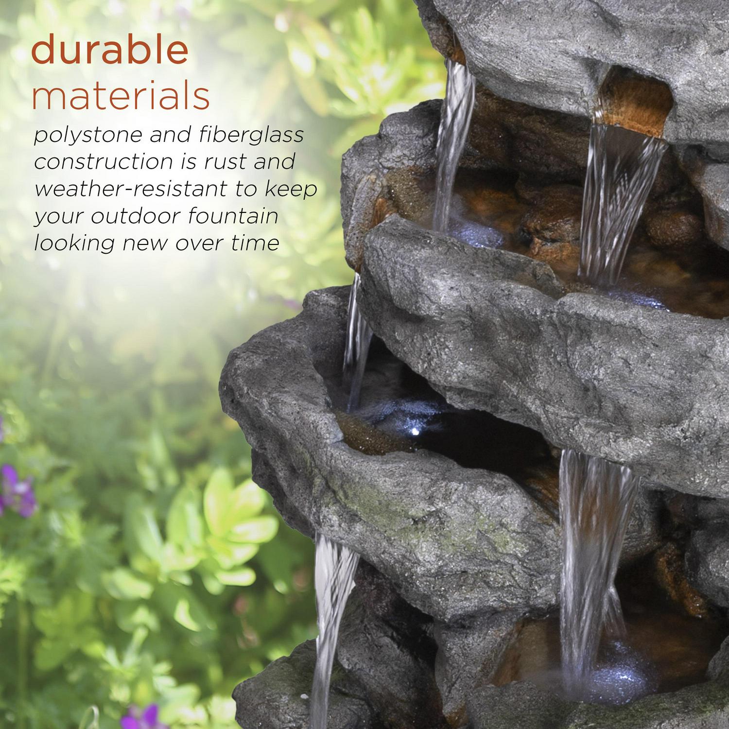 – Polyresin, stone powder, fiberglass and plastic construction is rust and weather-resistant to keep your outdoor fountain looking new overtime