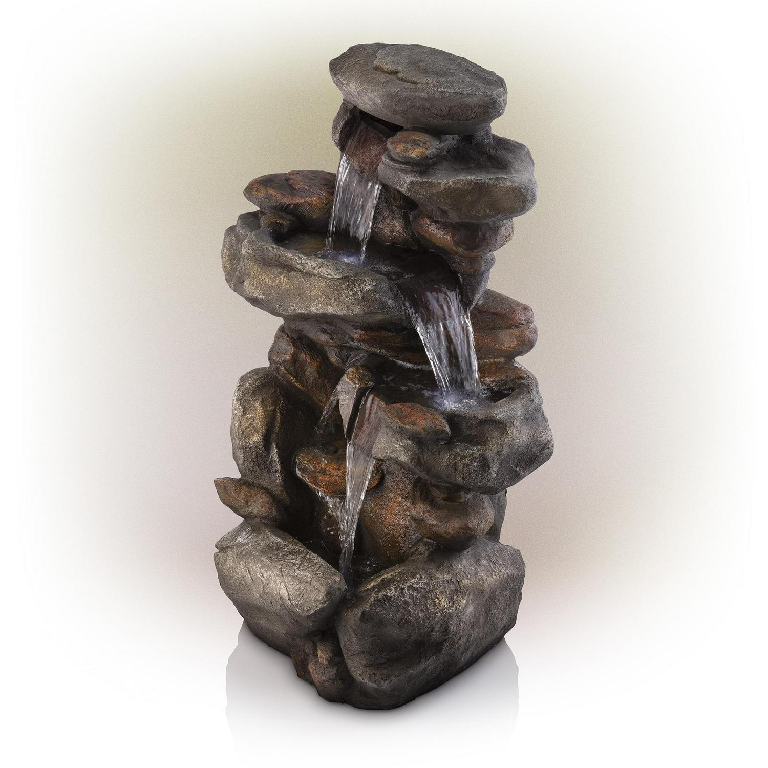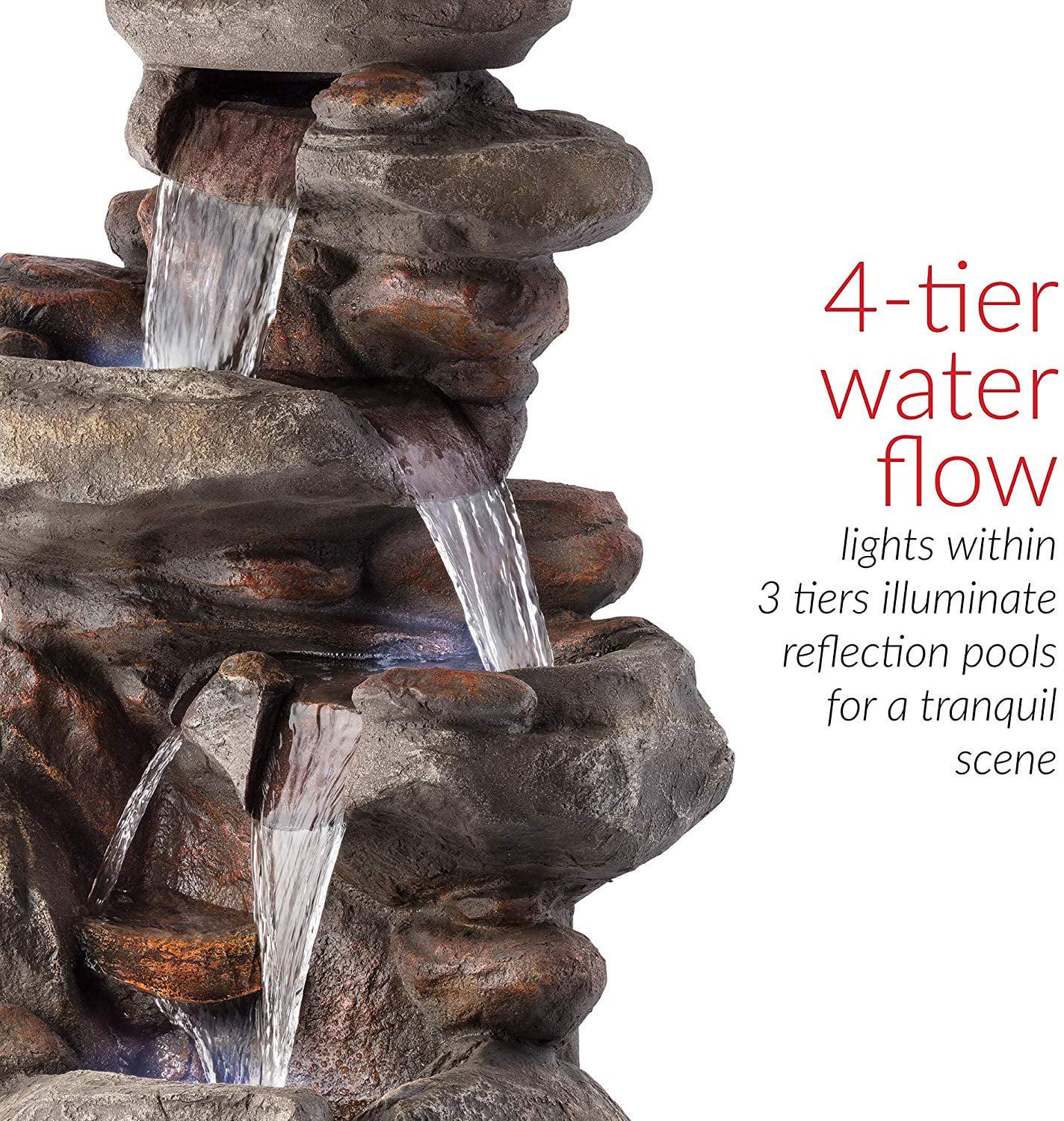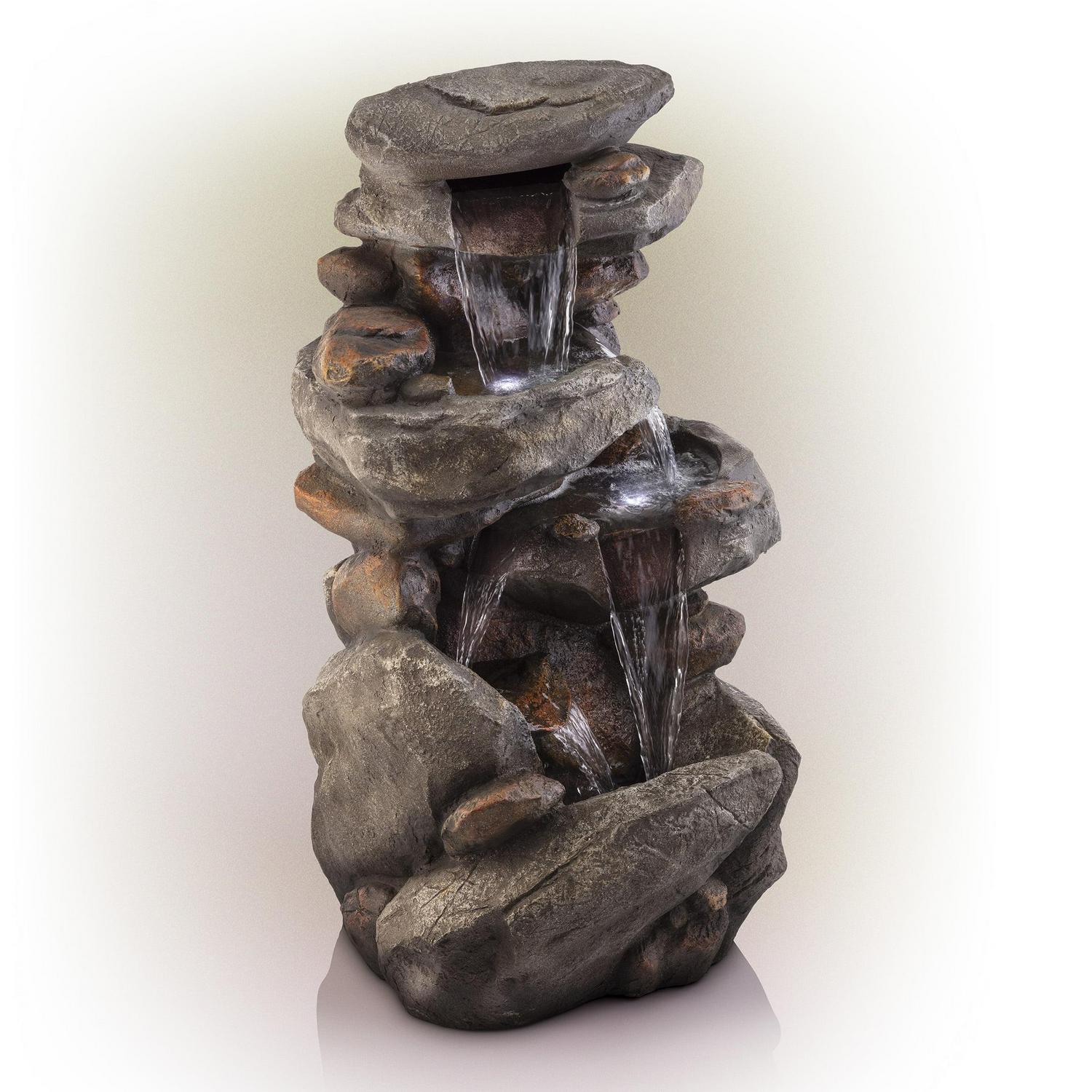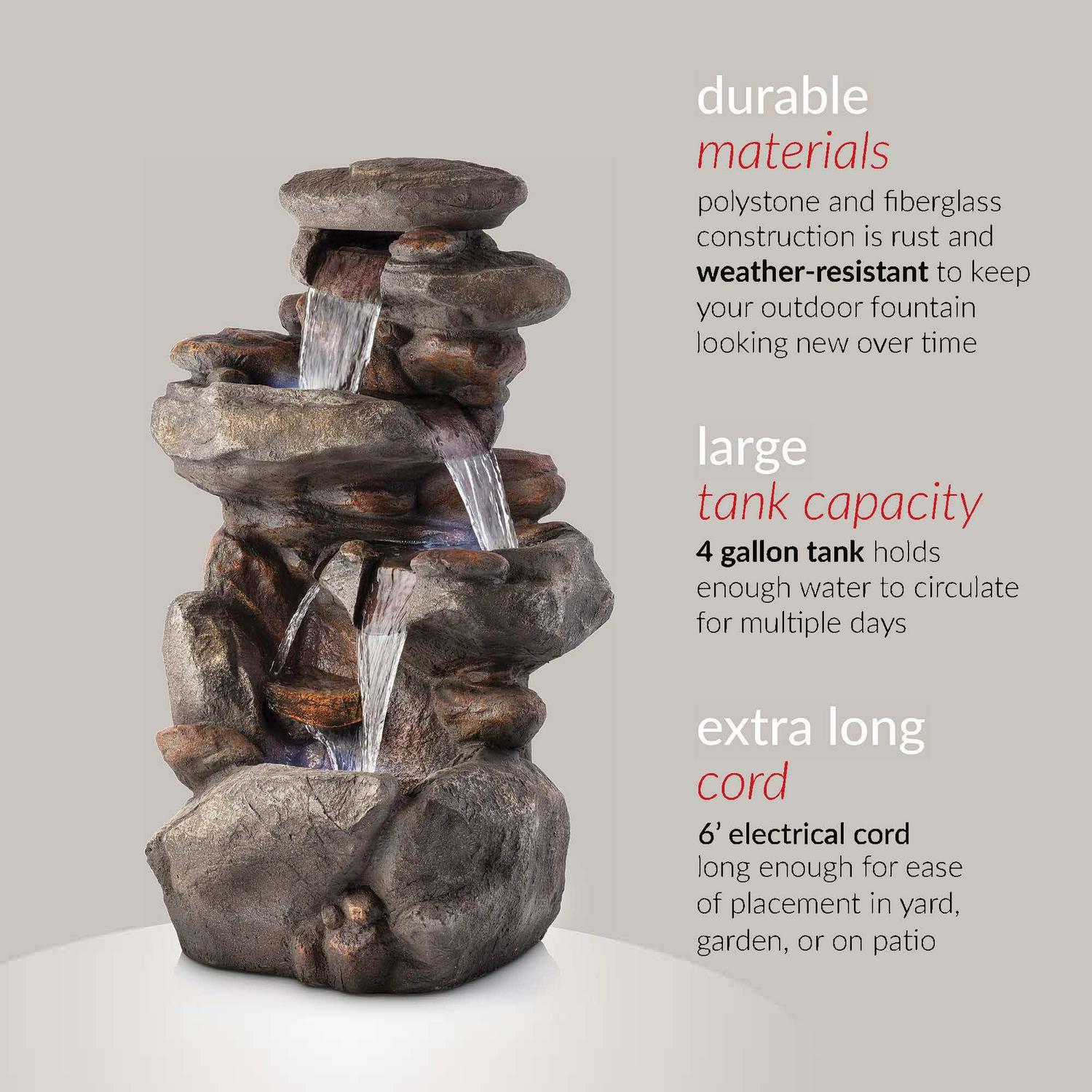 Relax and enjoy the sounds of nature with the Alpine Corporation 4-Tier Rock Fountain! You will feel like you are sitting next to a majestic mountain stream in the great outdoors all while relaxing in your own backyard. This outdoor fountain looks great in your garden, patio, deck, porch, or yard space. Take in the tranquil sounds of the water gently cascading over natural-looking grey stone. The polystone and fiberglass construction is weatherproof, rust-resistant, and durable for years of quality use. The three LED lights in the fountain tiers accent the movement of the trickling water for a subtle yet beautiful light source, day or night. To use, simply attach the pump to the hose, plug it into an outdoor outlet, fill the lower level with the water, and watch as the interior pump creates a lovely water flow reminiscent of a lush rainforest. With a 1-year warranty, you can be confident in the quality of your purchase. Add LED Light feature and a blurb of how it creates a relaxing ambiance at night.