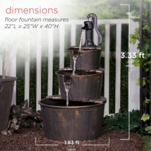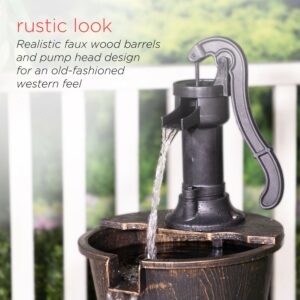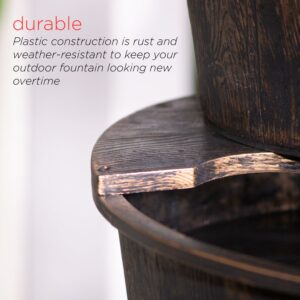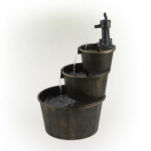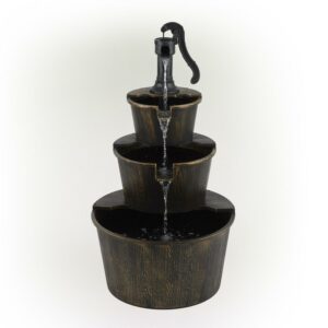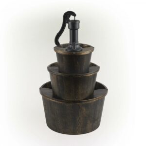 Add a touch of vintage fun to your outdoor space with the Alpine Corporation Pump and Barrel Fountain. Enjoy the sound of trickling water that pours from the pump spout, down through the three layers of barrel buckets. The design adds an old-fashioned rustic element to your space. This outdoor fountain looks great in your garden, patio, deck, porch, or yard space. The plastic construction is weather-proof, rust-resistant, and durable for years of quality use. The weight of the fountain and sturdy base allow it to stay upright in the strongest wind. To use, simply plug in to an outdoor outlet, fill upper level with water, and watch as the interior pump creates a lovely water flow. The cord is 6 feet long, giving you plenty of options for placement. Fountain measures 22″L x 22″W x 40″H for use in yards of any size.