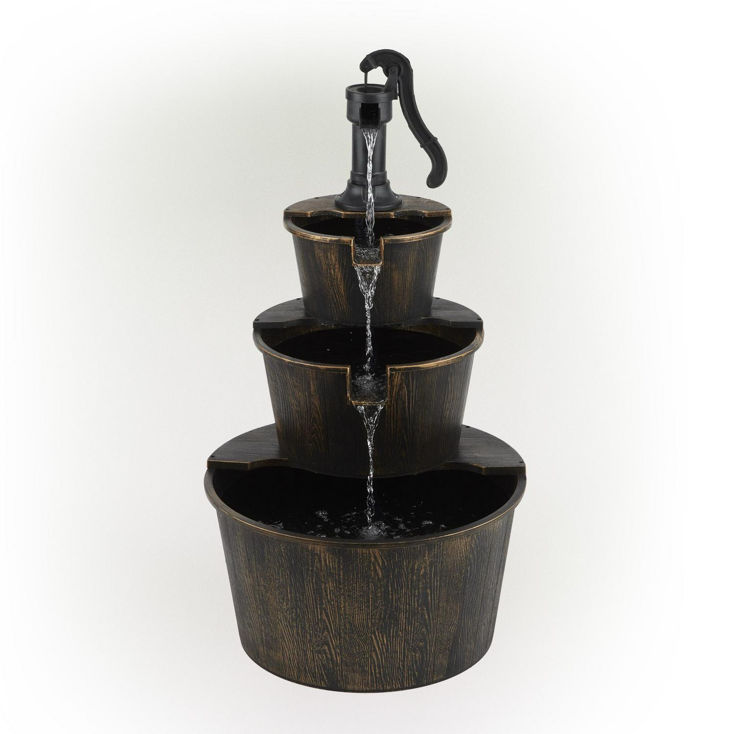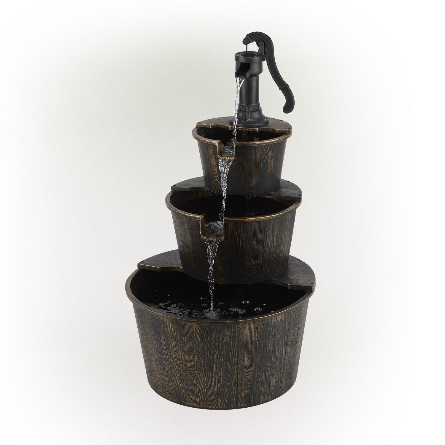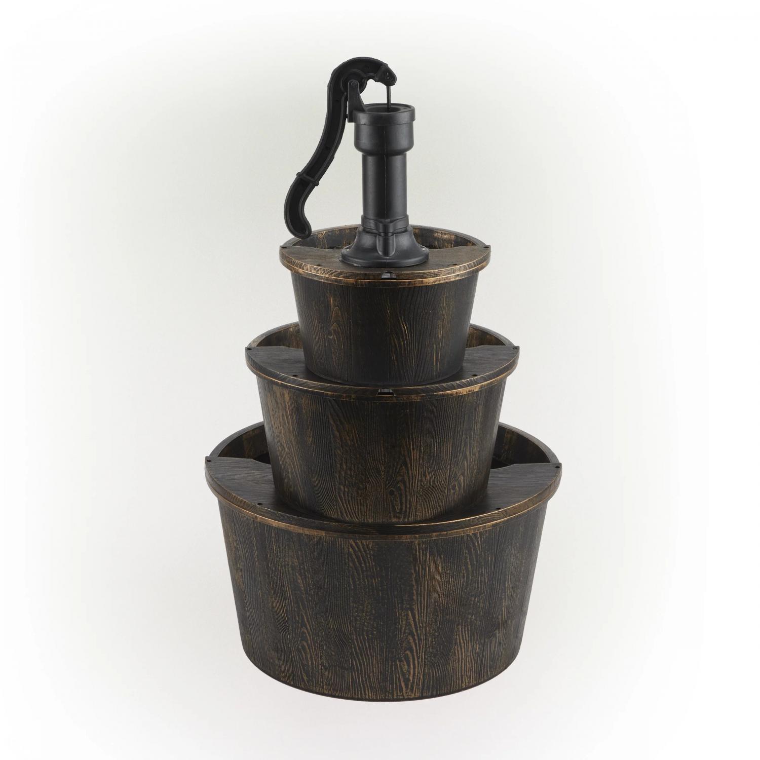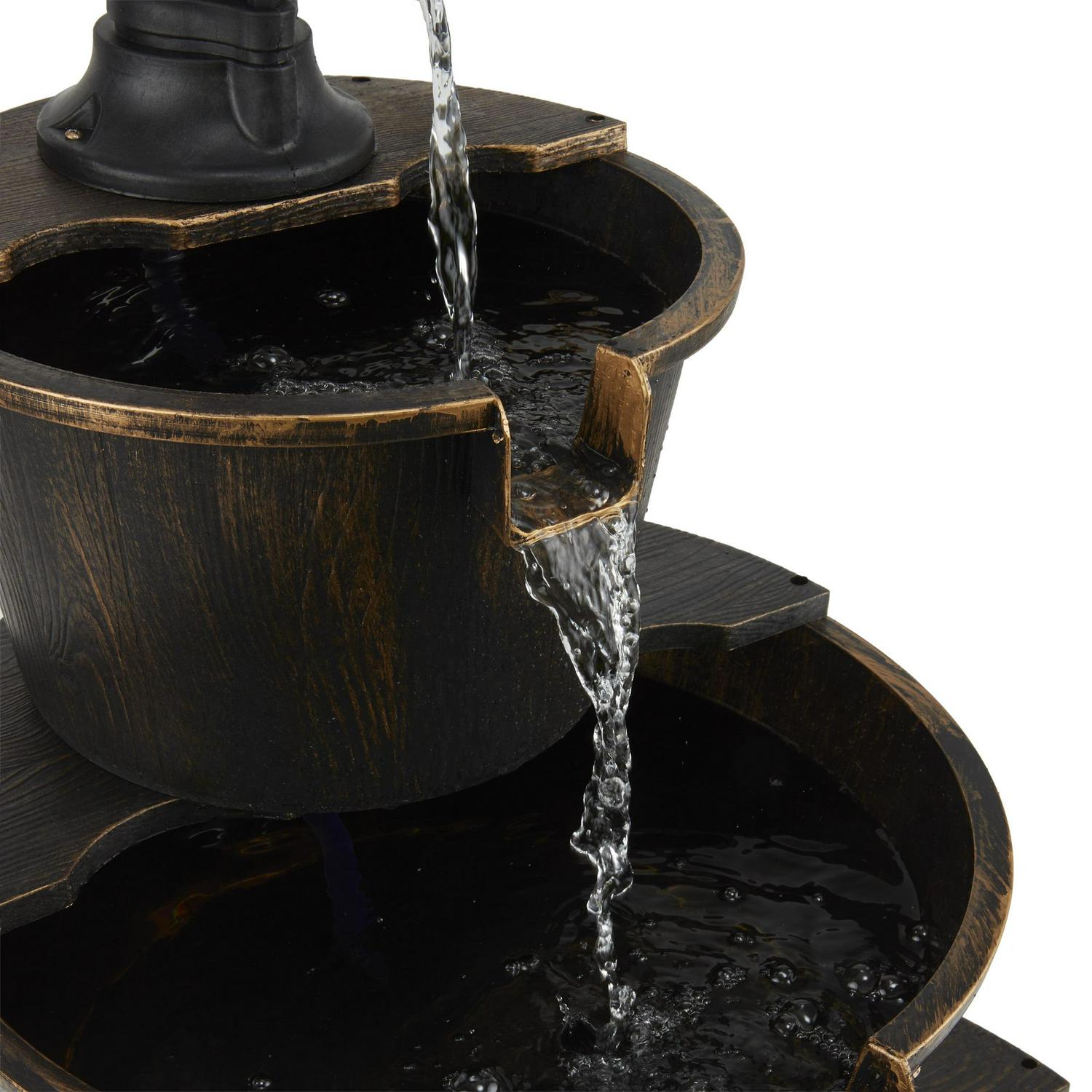 – Water trickles from the pump spout into the barrel tiers, adding peaceful ambiance to your outdoor setting