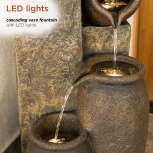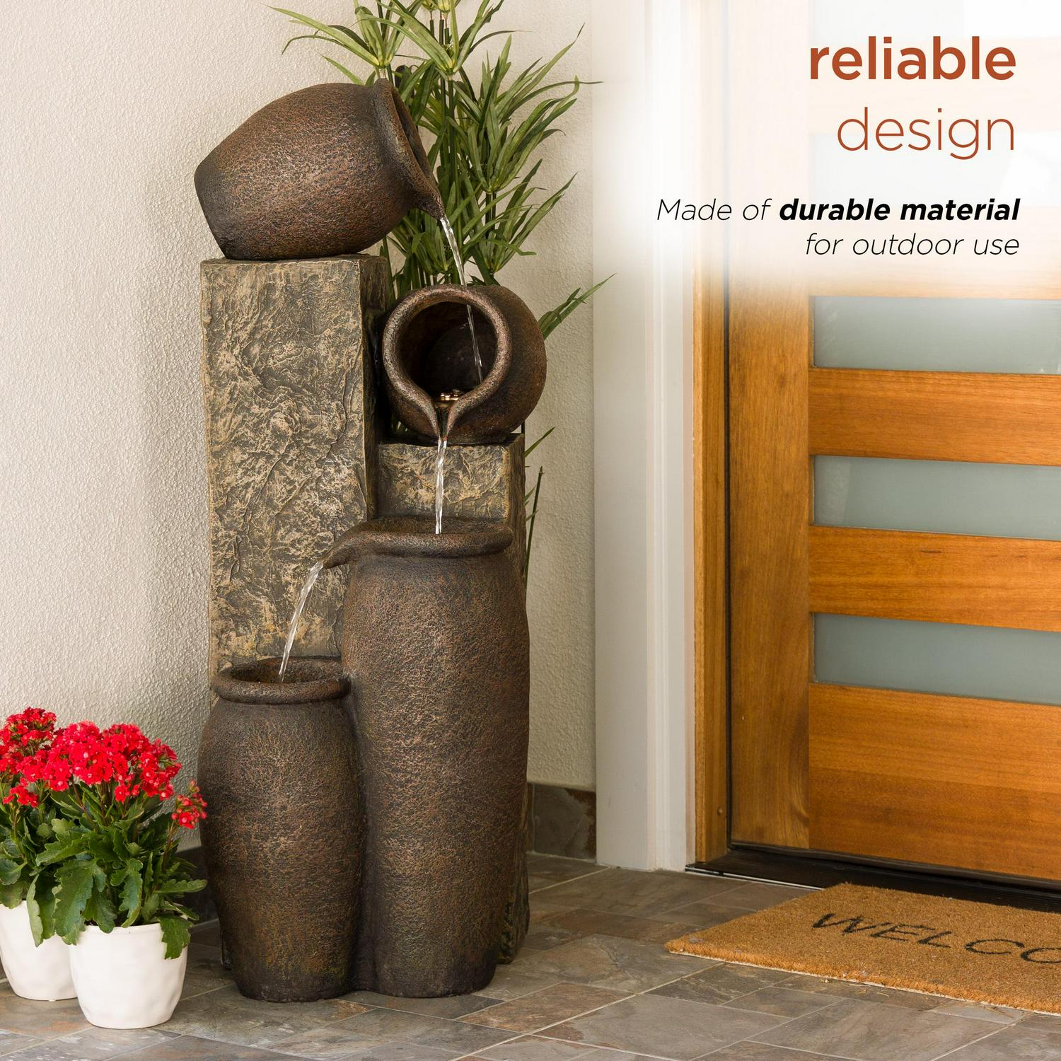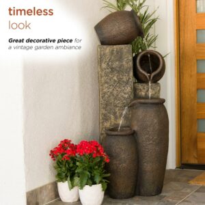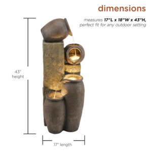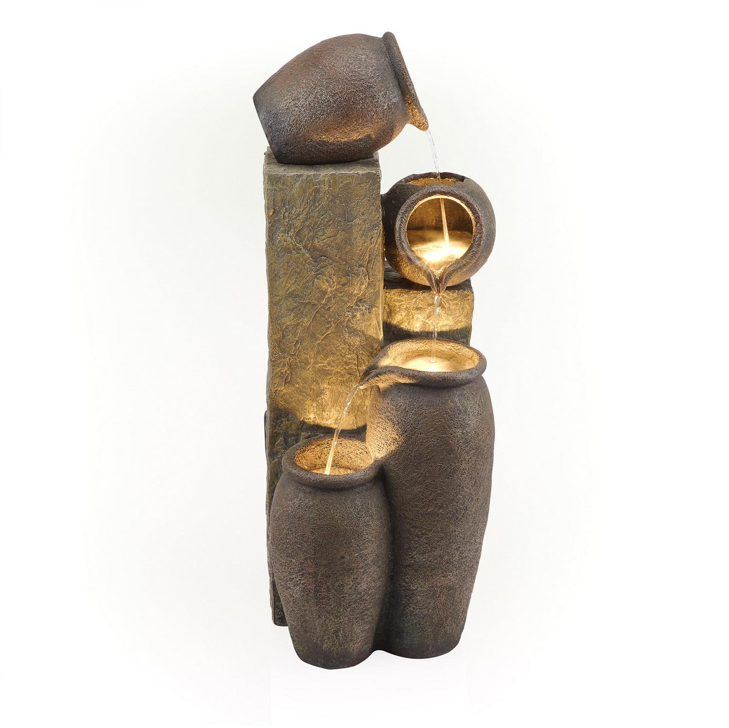 Unplug from the day and meditate to the sound of flowing water with Alpine Corporation s 43″ tall Outdoor Pottery Fountain with Replaceable LED Lights. This relaxing floor fountain statue provides a tranquil and soothing addition to your yard, porch, or patio. Constructed from durable polystone the fountain is weatherproof, rust-resistant, and resilient for use in your home’s interior décor or outside. This unique and versatile decor piece includes replaceable white LED lights. Relax to the sounds of the calming natural water flow as it trickles down through the pottery. For quick installation, the fountain includes all necessary parts, including a pump, to begin creating an outdoor oasis. This fountain measures 17″L x 18″W x 43″H to fit almost any indoor or outdoor space and includes a one-year manufacturer’s warranty from date of purchase.