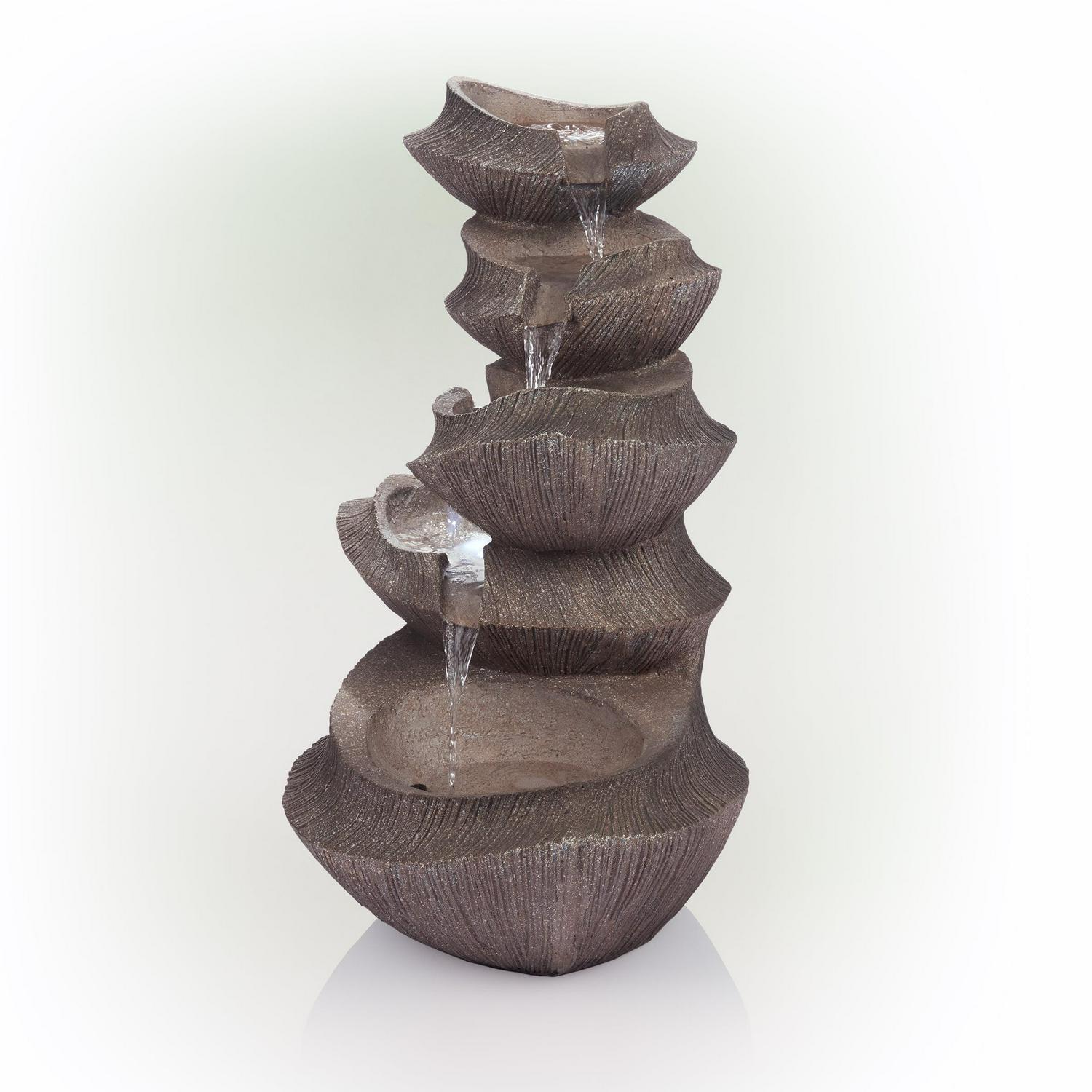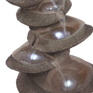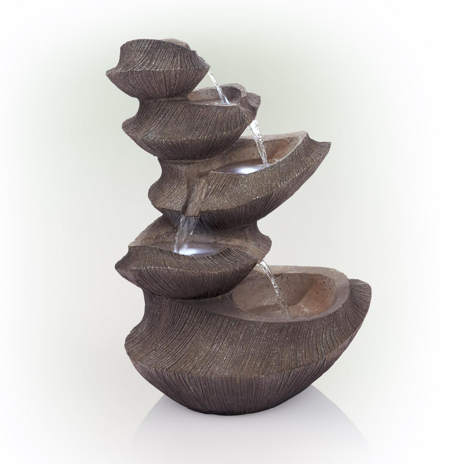 Enhance your outdoor living space with the Alpine Corporation Cascading Basins Fountain. Functional and attractive, this 5-tier floor fountain provides a tranquil, soothing, and elegant addition to almost any outdoor setting including porches, yards, gardens, patios, sunrooms, and more. The soft, natural sounds of water cascading gently down the basins creates a calm and relaxing atmosphere, and the fountain’s natural appearance effortlessly blends in and compliments its surroundings. It features four LED lights that effortlessly light up the fountain to enhance the flowing water. Constructed from durable polystone, this resilient tiered fountain is weather and rust-resistant to offer years of quality use. The fountain measures 22″ x 17″ x 31″ for the perfect fit outside your home.