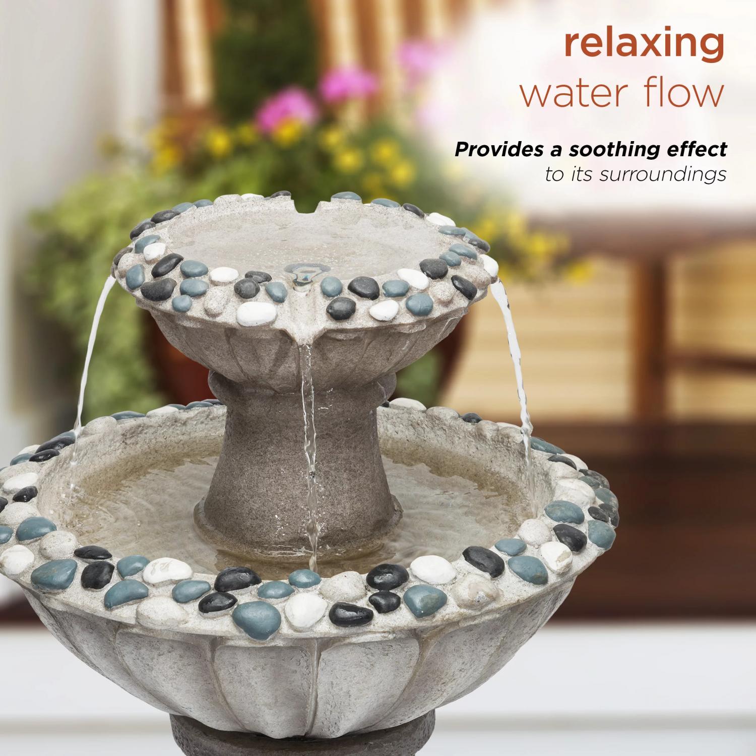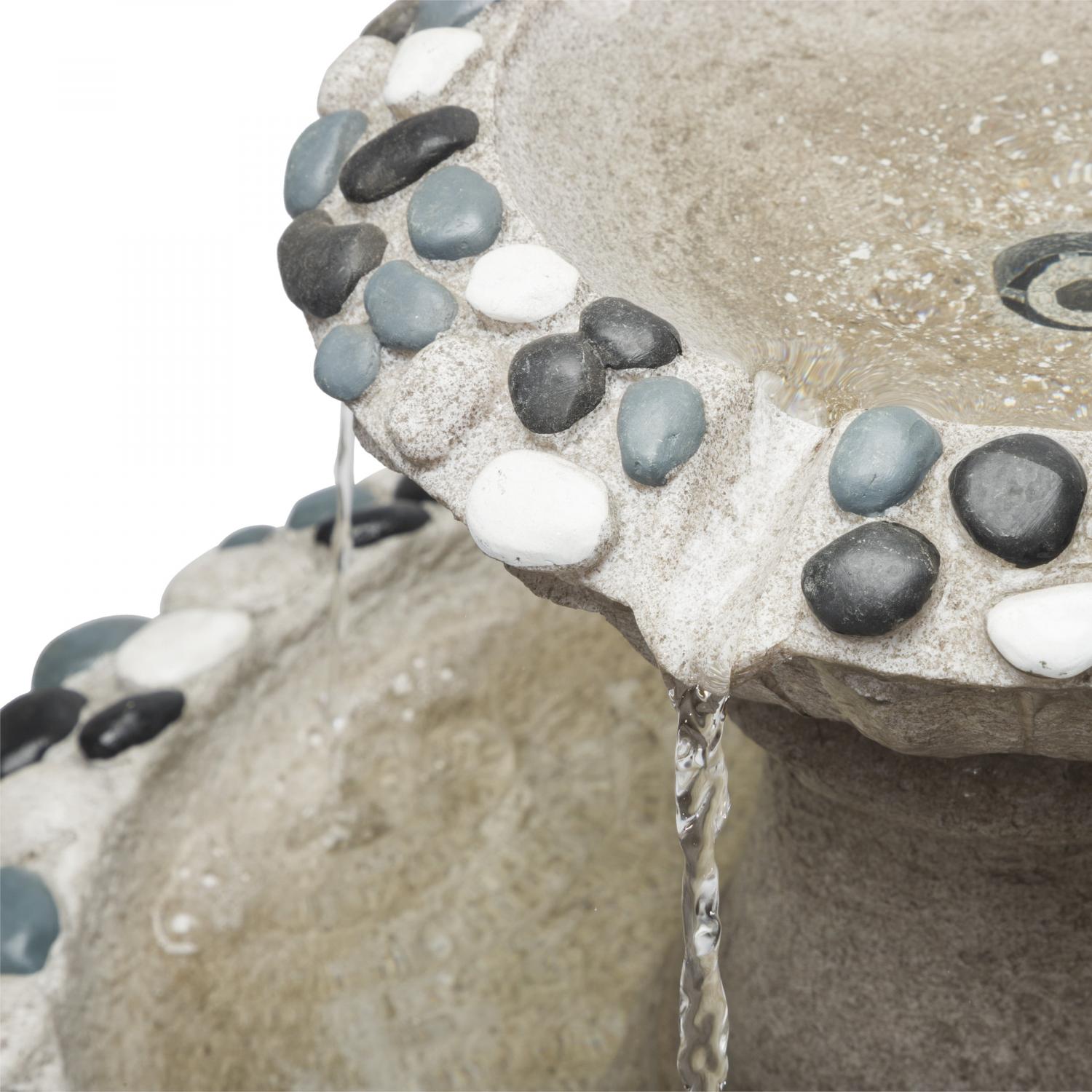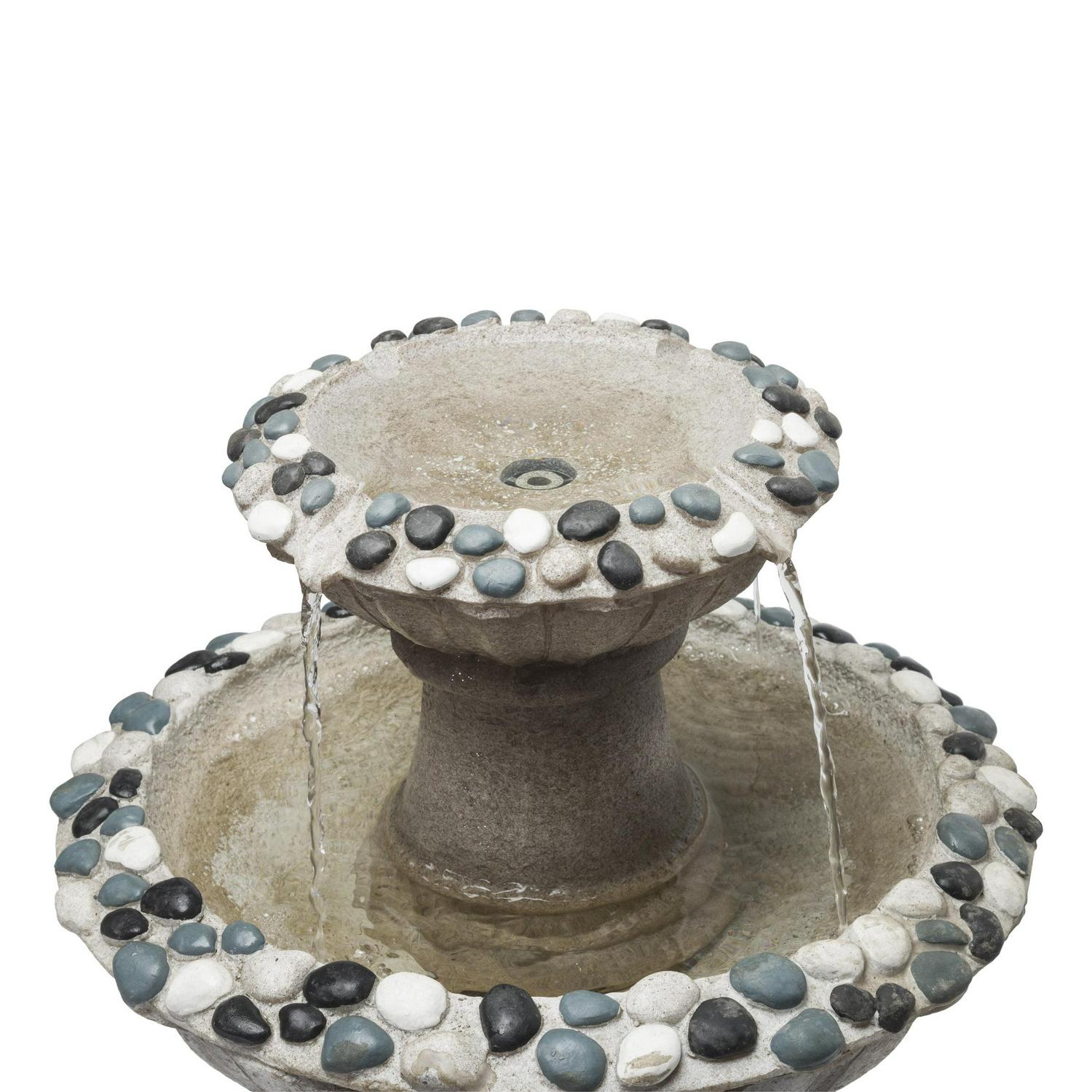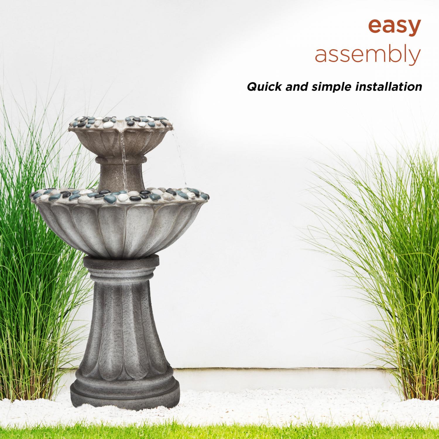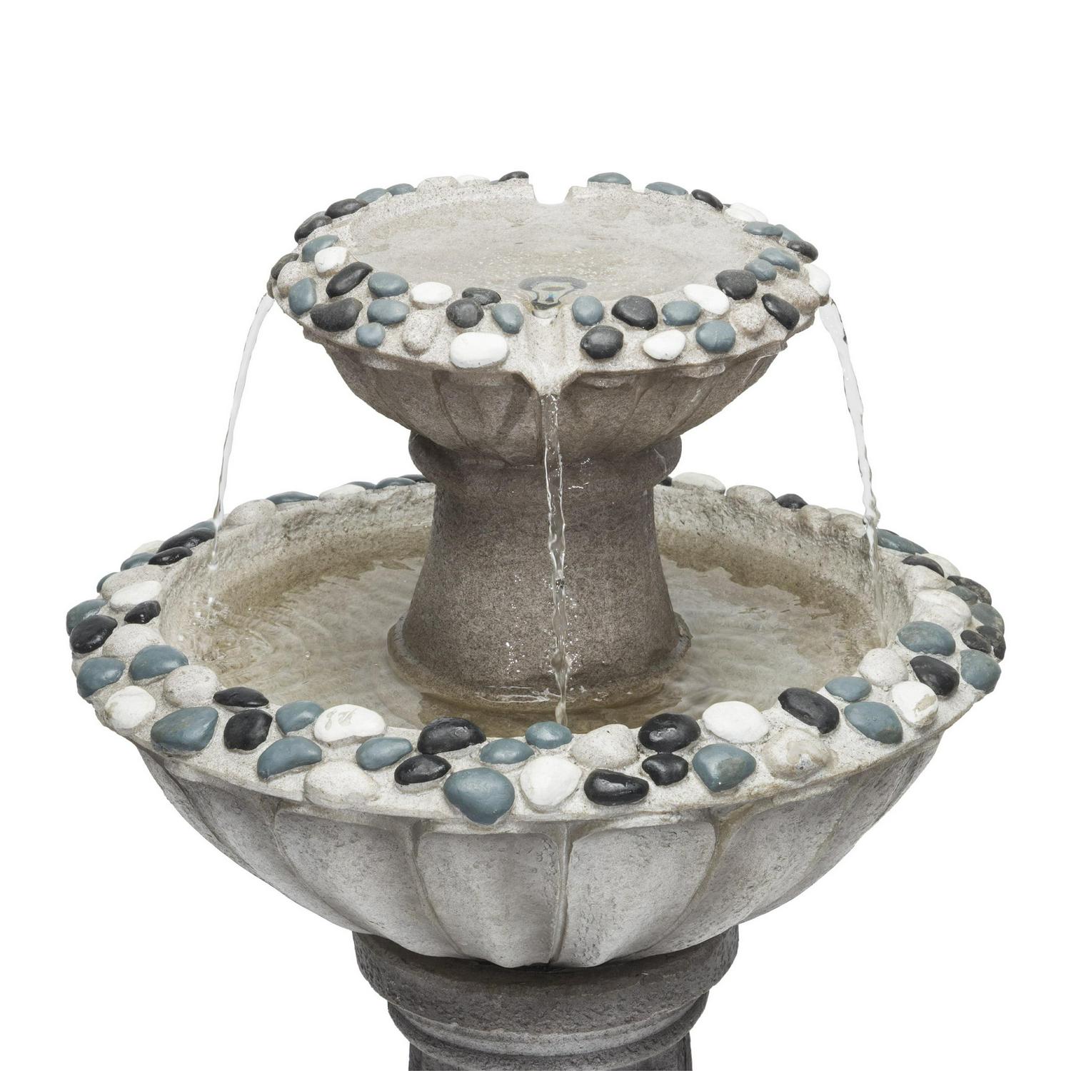 - Classic looking, two tier gray stone finish fountain with a rippled design and texture