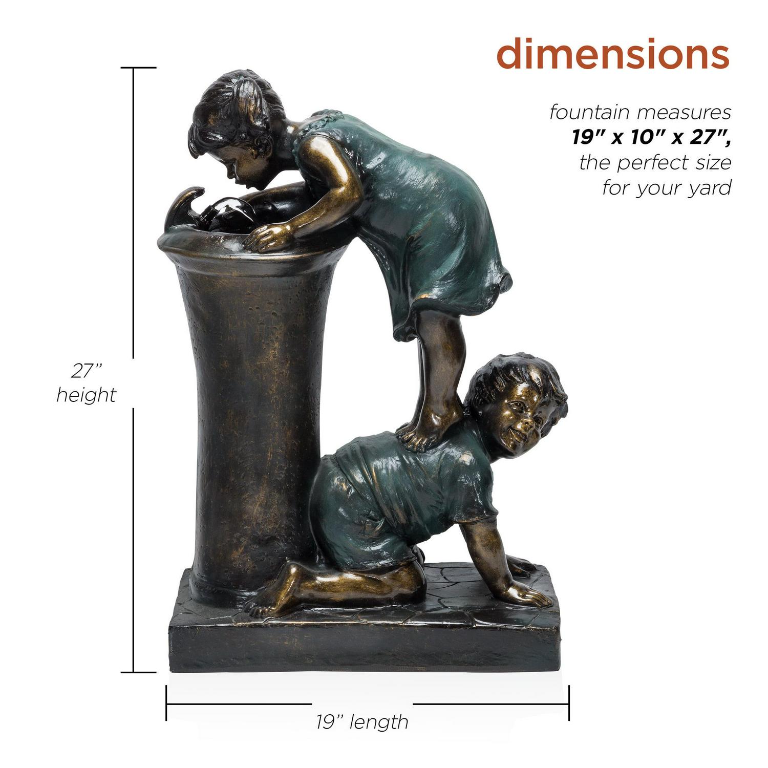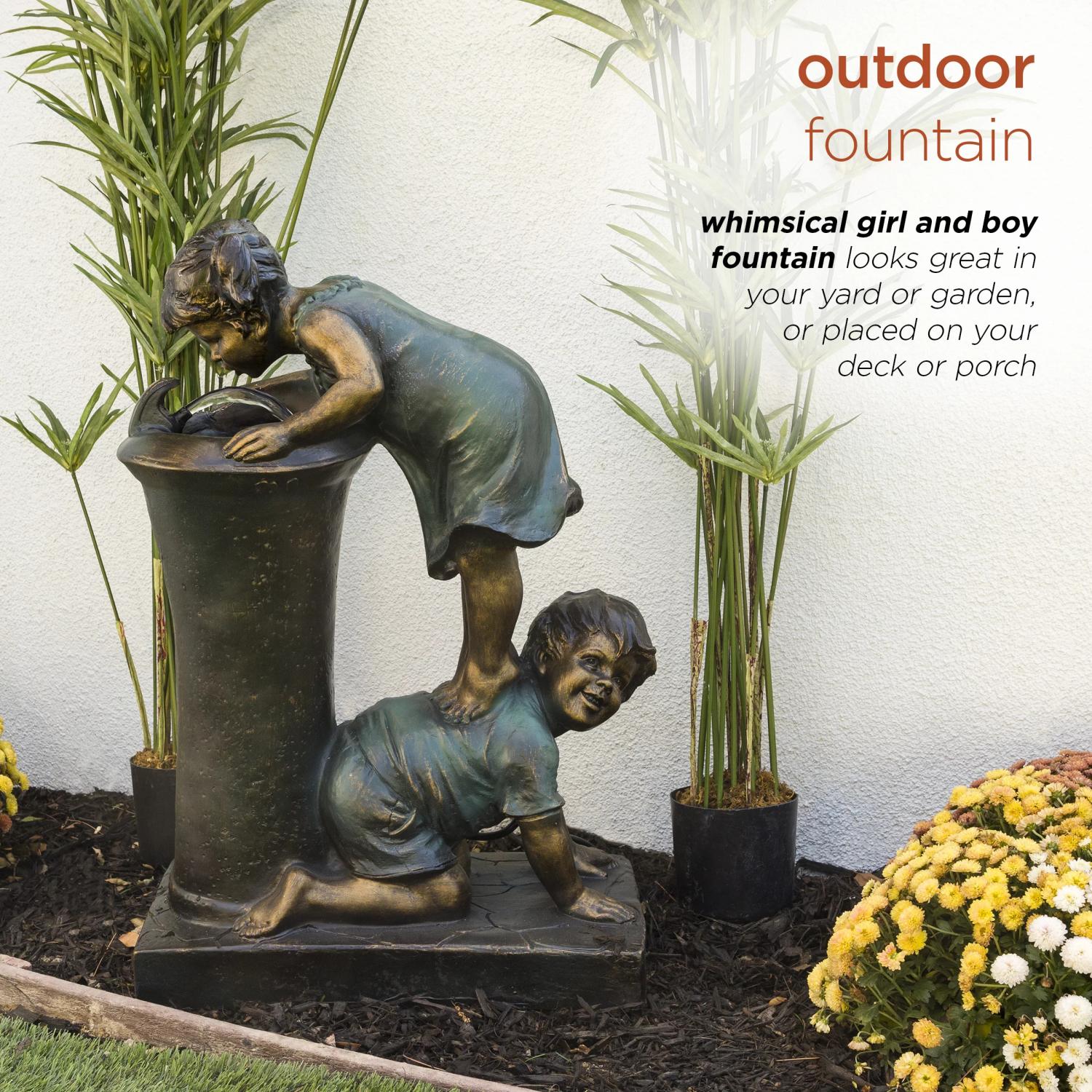 - Whimsical girl and boy fountain looks great in your yard or garden, or placed on your deck or porch