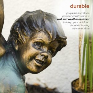 Add a touch of childish whimsy to your outdoor space with the Alpine Corporation Girl and Boy Drinking Water Fountain. This stunning fountain is constructed with durable polyresin and stone powder with an antique bronze finish to match any decor. The fountain is weather-proof, rust-resistant, and durable for years of quality use. With its antique-look, intricate details and portrayal of timeless children, this Alpine fountain is sure to bring peace and tranquility to your home! The statue is perfect for your garden, patio, deck, porch, or yard space. Fountain measures 19″L x 10″W x 27″H for use in yards of any size.