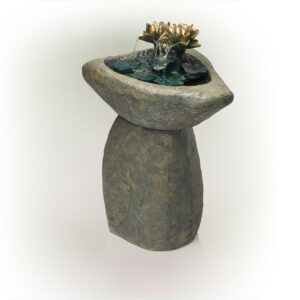 Relax and enjoy the sounds of nature with the Alpine Corporation Lotus Rock Fountain! This outdoor fountain looks great in your garden, patio, deck, porch, or yard space. The boulder pedestal supports an open boulder with lotus flowers and lily pads which provide a gentle cascade of water that emits a calming, relaxing sound you’ll love at the end of the day. Completely natural in appearance, the fountain is actually crafted of durable polyresin, cement, and stone powder. LED lights in each of the lotus flowers illuminate your space, drawing attention to the relaxing water pools day or night for added ambiance. To use, simply plug in to an outdoor outlet, fill lower level with water, and watch as it creates a lovely water flow reminiscent of a lush rain forest. With a 1-year warranty, you can be confident in the quality of your purchase. Fountain measures 24″L x 17″W x 30″H for use in yards of any size.