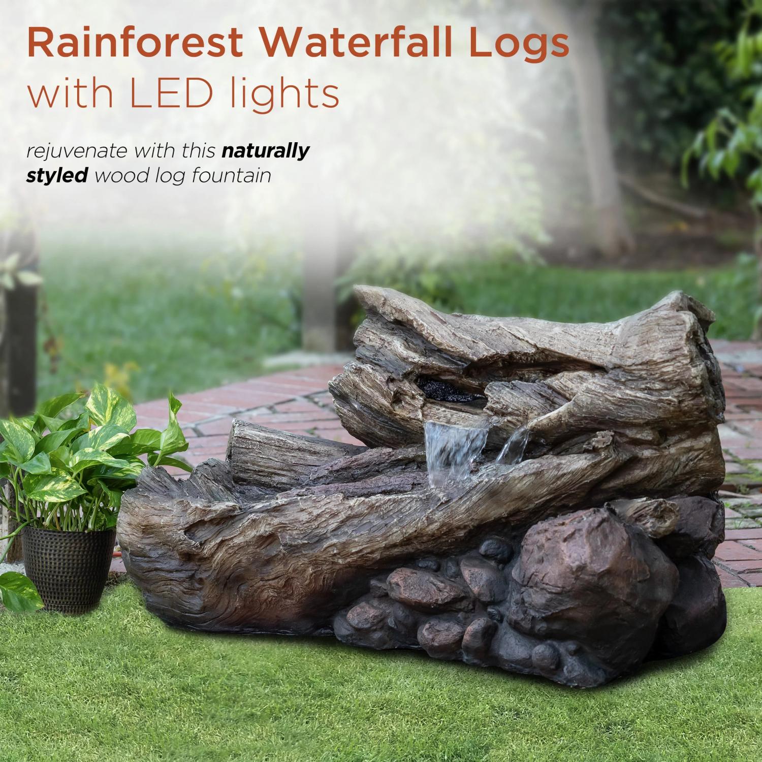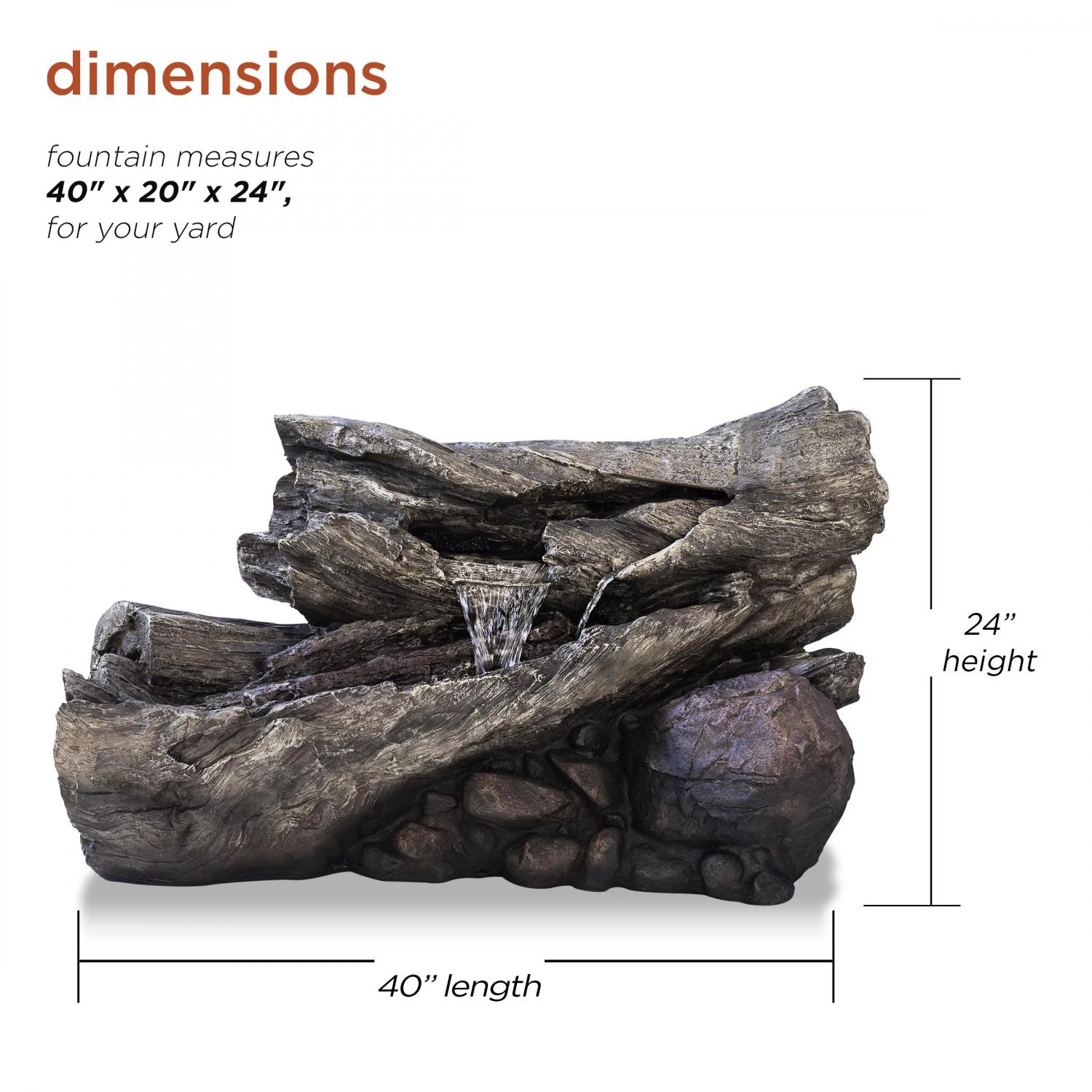 Relax and enjoy the sounds of nature with the Alpine Corporation 2-Tier Fallen Tree Trunk Fountain! This outdoor fountain looks great in your garden, patio, deck, porch, or yard space. The front of the log opens up to reveal a gentle cascade of water that emits a calming, relaxing sound you’ll love at the end of the day. Completely natural in appearance right down to the rocky base, the fountain is actually crafted of durable, weather-resistant fiberglass. LED lights in the lower tier illuminate your space, drawing attention to the relaxing water pool day or night for added ambiance. To use, simply plug in to an outdoor outlet, fill lower level with water, and watch as the interior pump creates a lovely water flow reminiscent of a lush rainforest. With a 1-year warranty, you can be confident in the quality of your purchase. Fountain measures 40″L x 20″W x 24″H for use in yards of any size.