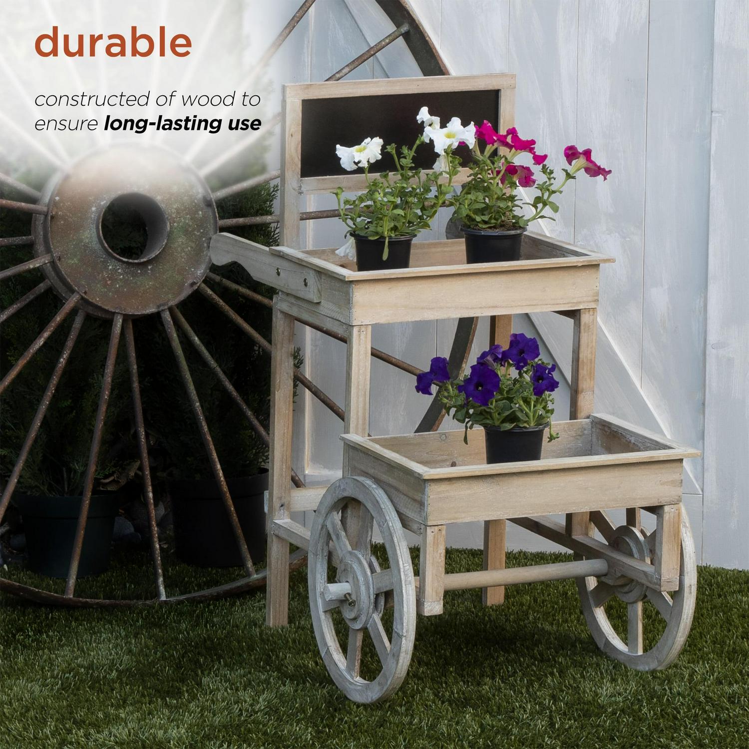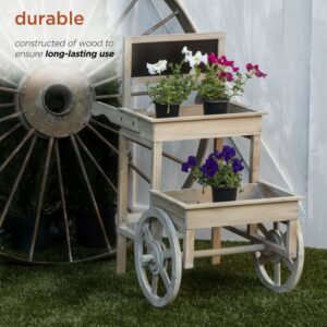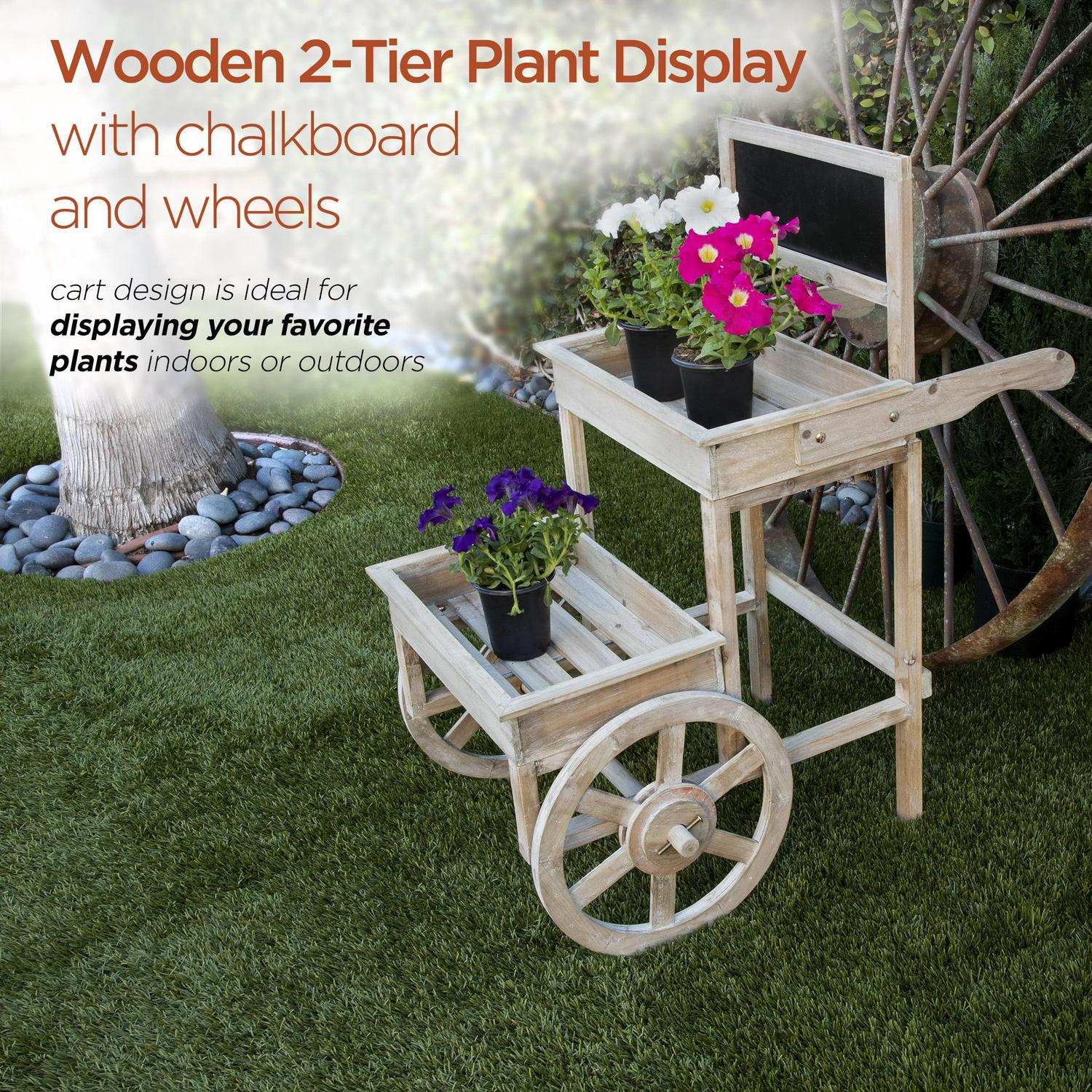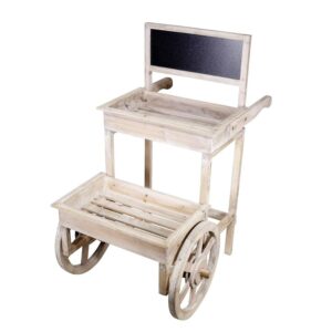 Display your greenery with the Alpine Corporation Wooden 2-Tier Plant Display Stand with Chalkboard. Ideal for use indoors and outdoors, this cart comes fashioned with wheels for easy transportation between the two spaces. Fill with your favorite potted plants and write messages on the chalkboard! The cart is made of durable materials that will perfect your home, yard, and garden decor. The farmhouse-style wood adds a touch of elegance to any indoor or outdoor space. With a 1-year warranty, you can be confident in the quality of your purchase. Cart measures 31″L x 22″W x 34″H, ideal for any space.