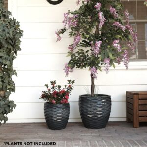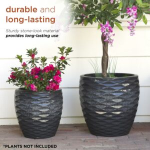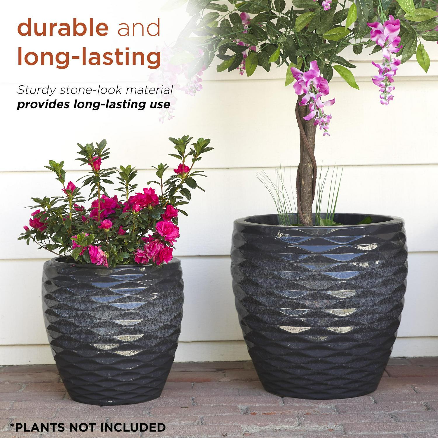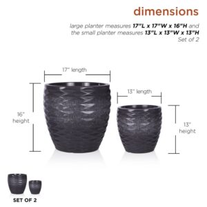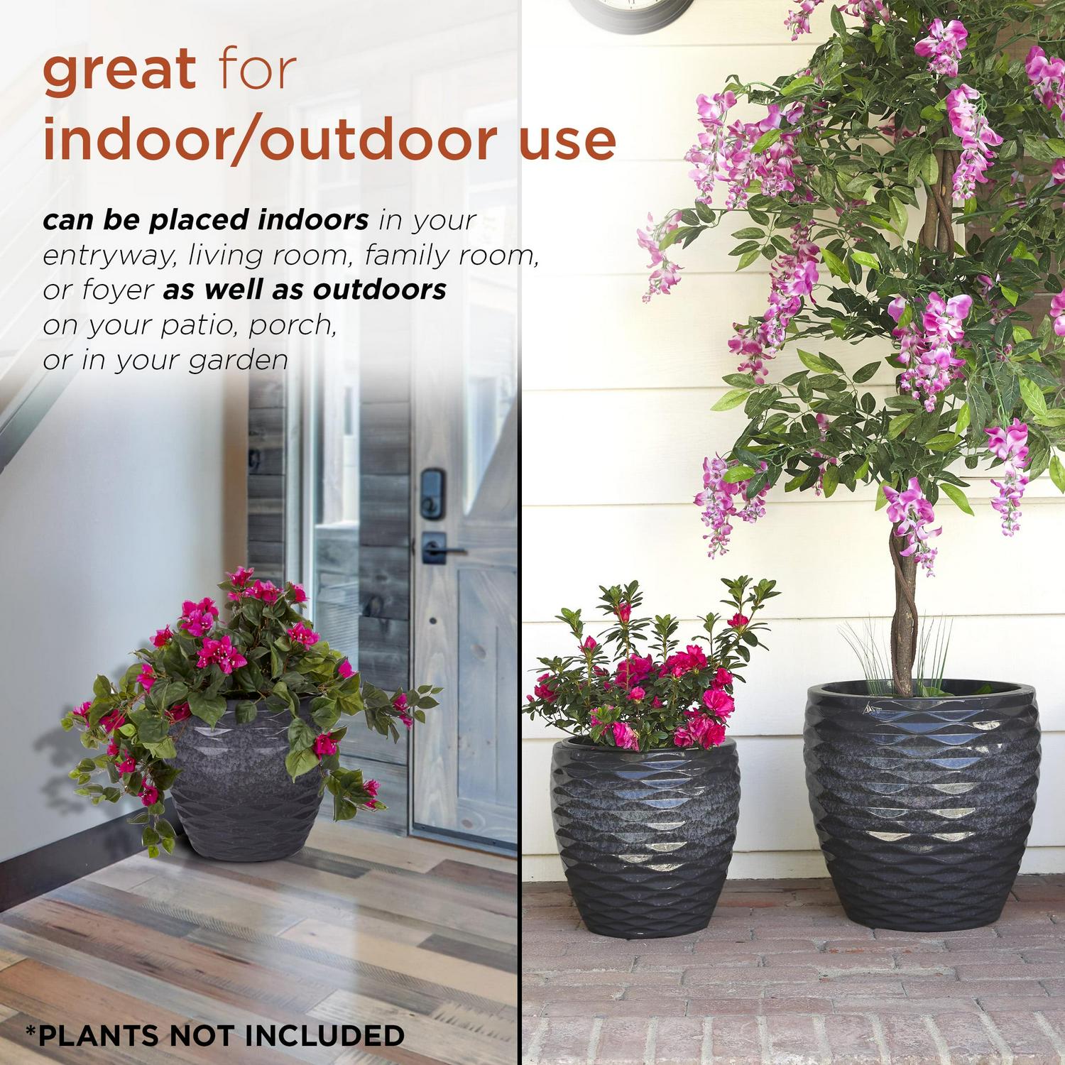 Enhance your indoor or outdoor living space with the Alpine Corporation Set of 2 Embossed Wave Planters. Functional and attractive, these assorted size decorative flower planters provide a stylish way to plant your favorite flowers and greenery indoors or outdoors. Their contemporary design with an elegant embossed wave pattern in a speckled dark gray finish will complement any decor in your entryways, patios, living rooms, porches, gardens, flowerbeds, and more. Featuring integrated drainage holes with removable plugs, you can conveniently plant directly into the planters and ensure your plants are provided with proper drainage after watering. Constructed from durable materials, these stone-look planters offer years of quality use. The small planter measures 13″ x 13″ x 13″ and the large planter measures 17″ x 17″ x 16″ for the perfect fit inside or outside your home.