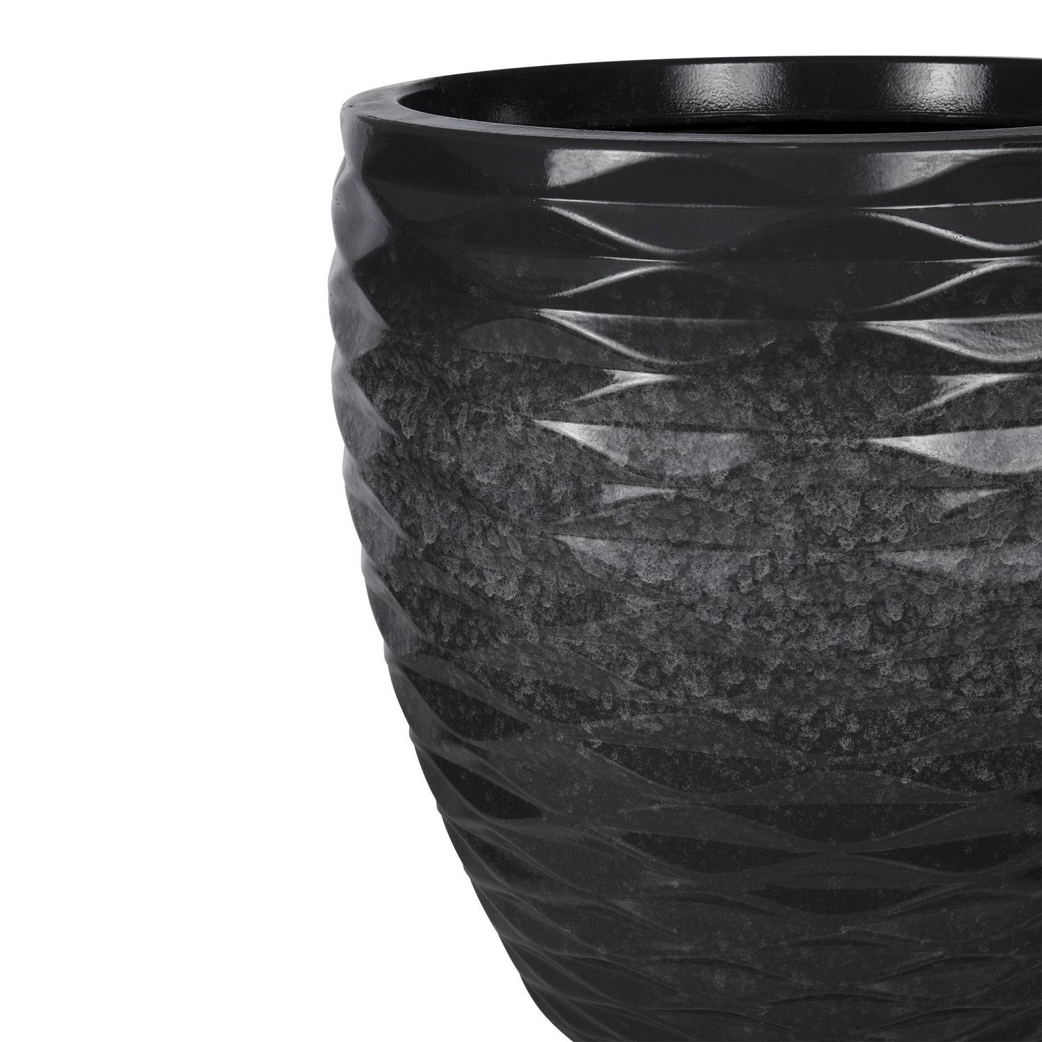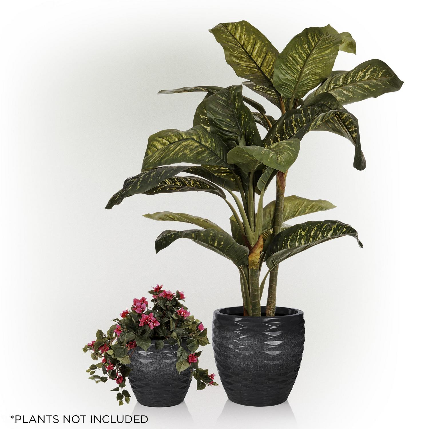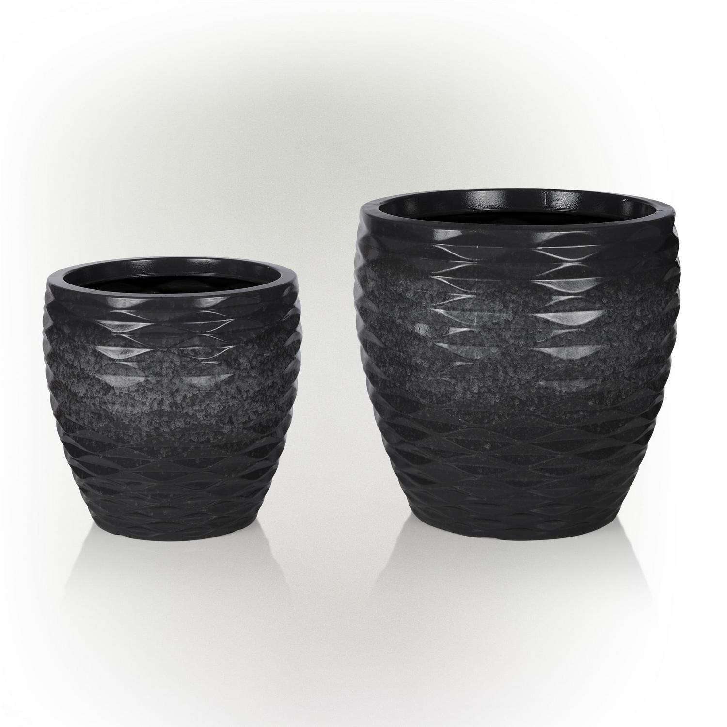 Enhance your indoor or outdoor living space with the Alpine Corporation Set of 2 Embossed Wave Planters. Functional and attractive, these assorted size decorative flower planters provide a stylish way to plant your favorite flowers and greenery indoors or outdoors. Their contemporary design with an elegant embossed wave pattern in a speckled dark gray finish will complement any decor in your entryways, patios, living rooms, porches, gardens, flowerbeds, and more. Featuring integrated drainage holes with removable plugs, you can conveniently plant directly into the planters and ensure your plants are provided with proper drainage after watering. Constructed from durable materials, these stone-look planters offer years of quality use. The small planter measures 13″ x 13″ x 13″ and the large planter measures 17″ x 17″ x 16″ for the perfect fit inside or outside your home.