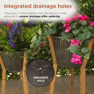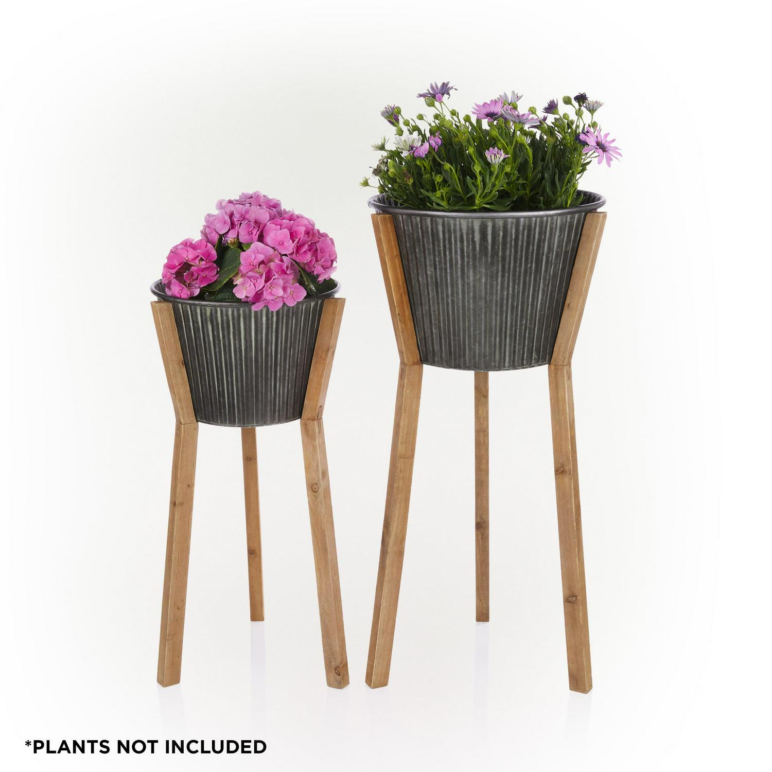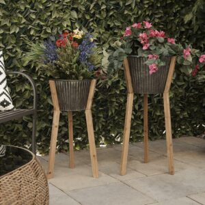 Alpine Corporation Set of 2 Metal Planters with Drainage Holes Wooden Stands