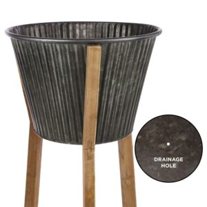 Enhance the natural beauty of your plants with the Alpine Corporation Metal Bucket Planters. This set of two coordinating planters feature galvanized metal buckets on wooden stands for a decorative way to display your plants and flowers. These versatile planters can be placed indoors in your entryway, living room, family room, or foyer as well as outdoors on your patio, porch, or in your garden. The integrated bottom holes allow you to plant directly into the planters while allowing for proper drainage after watering. The durable metal and wood construction provides long-lasting use. The small planter measures 12″L x 11″W x 24″H and the large planter measures 15″L x 14″W x 29″H, and they include a one year manufacturer’s warranty from date of purchase.