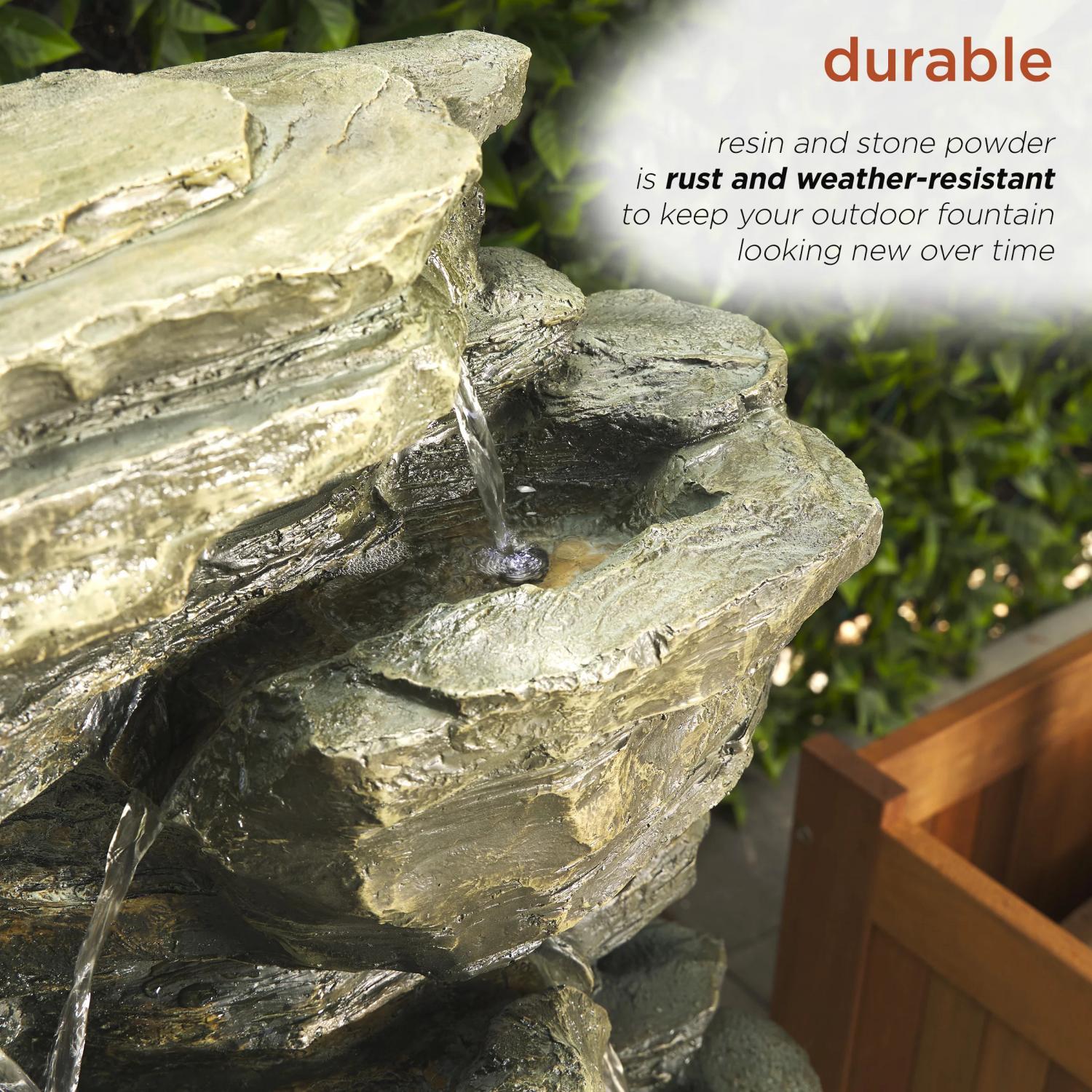 – Fiberglass construction is rust and weather-resistant to keep your outdoor fountain looking new overtime