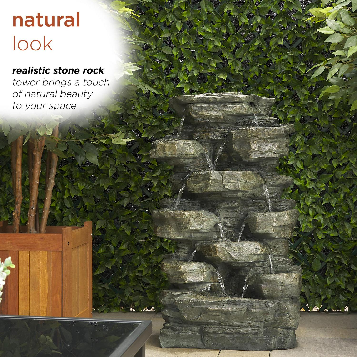 – Water trickles from each tier to mimic the sounds of a real waterfall, adding peaceful ambiance to your outdoor setting