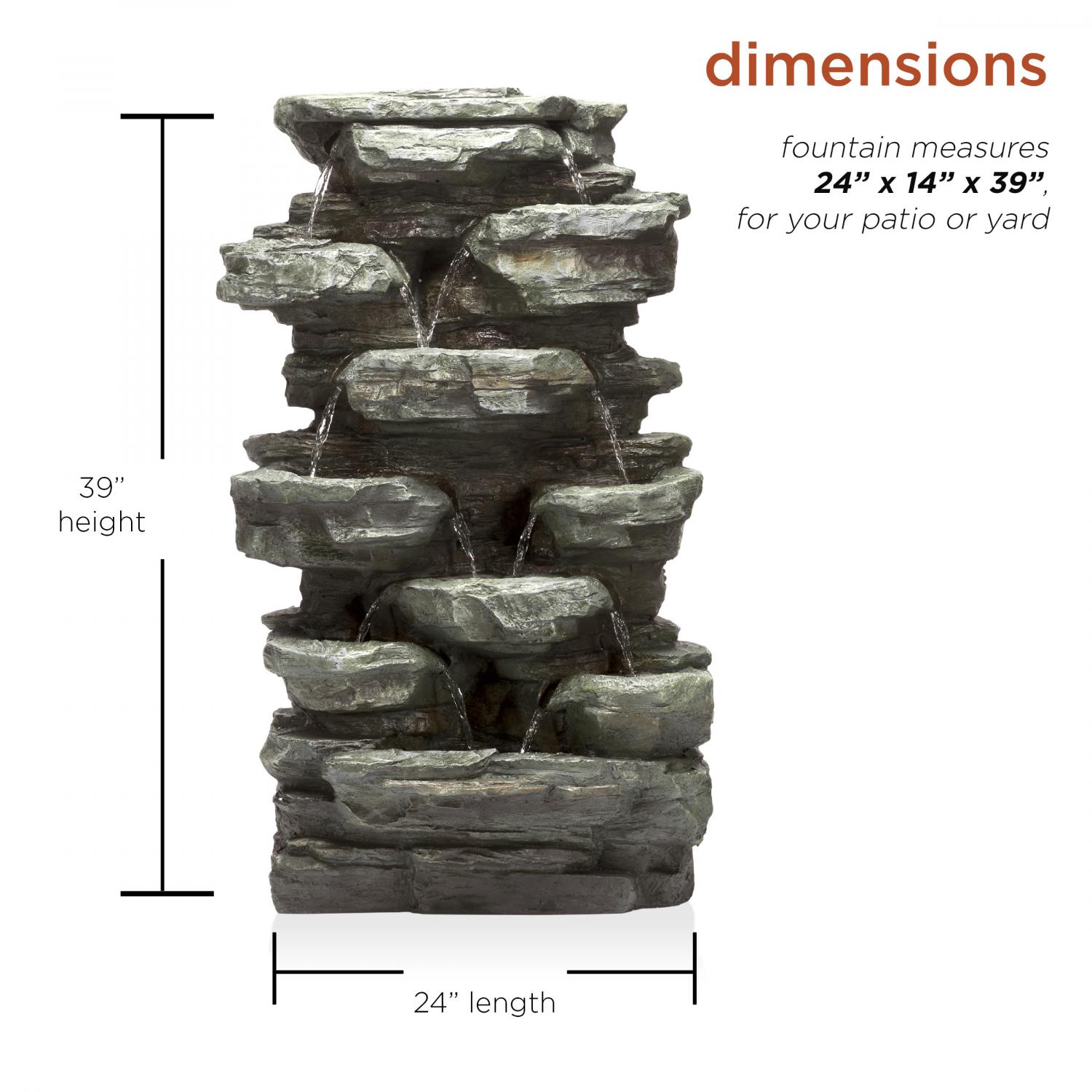 - Water fountain measures 24″L x 14″W x 39″H, the perfect size for your yard