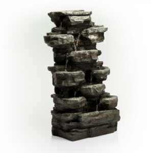 Relax and enjoy the sounds of nature with the Alpine Corporation 5-Tier Rock Pond Fountain! You will feel like you are sitting next to a majestic mountain stream in the great outdoors all while relaxing in your own backyard. This outdoor fountain looks great in your garden, patio, deck, porch, or yard space. Take in the tranquil sounds of the water gently cascading over natural-looking grey stone. The fiberglass construction is weather-proof, rust-resistant, and durable for years of quality use. Halogen lights in each of the tiers illuminate your space, drawing attention to the relaxing water pools day or night for added ambiance. To use, simply plug in to an outdoor outlet, fill lower level with water, and watch as the interior pump creates a lovely water flow reminiscent of a lush rainforest. With a 1-year warranty, you can be confident in the quality of your purchase. Fountain measures 24″L x 14″W x 39″H for use in yards of any size.