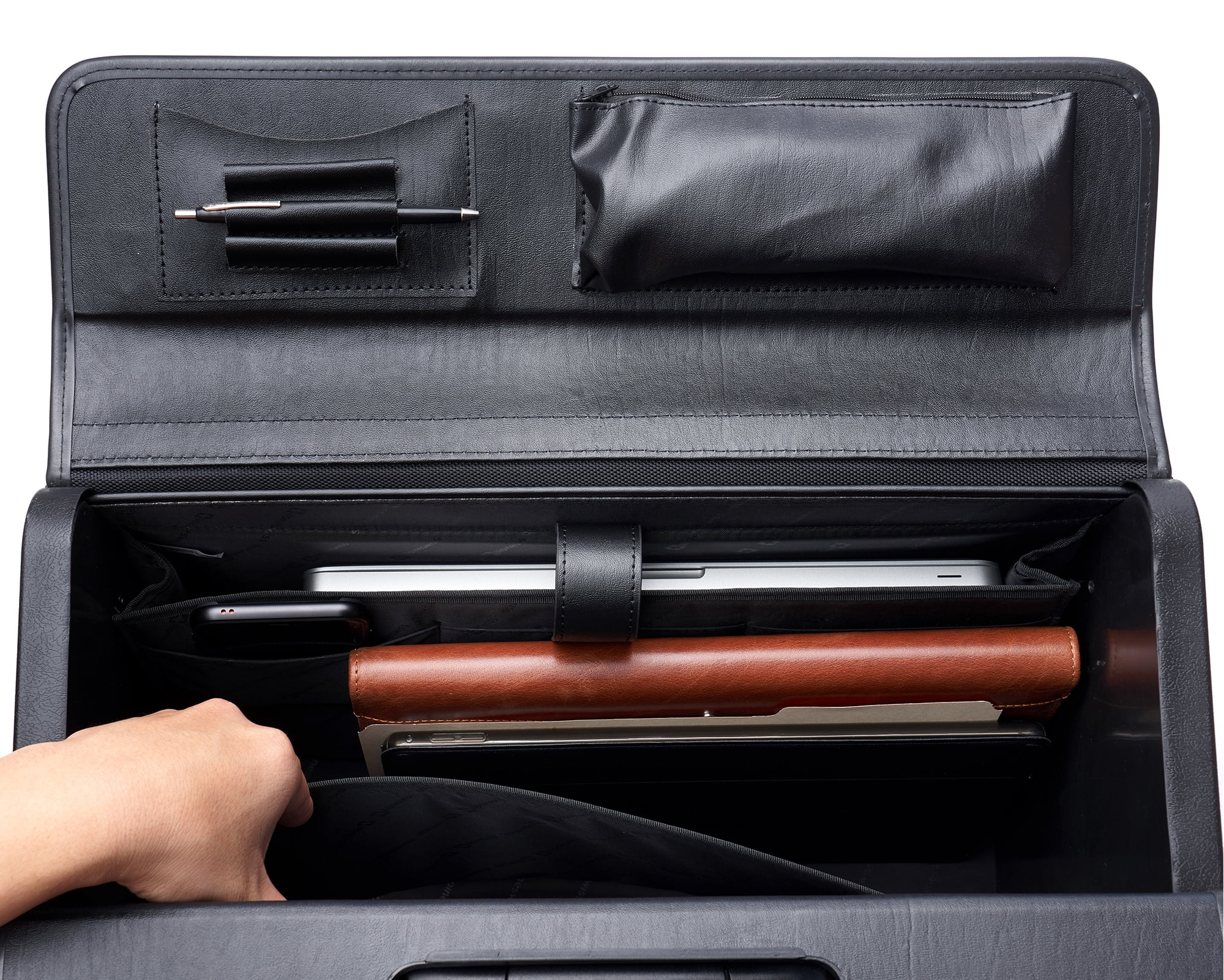 FREE SHIPPING 19” Rolling Catalog Case By Alpine Swiss Product Features: Leatherette TSA APPROVED CARRY ON SIZE – Measures 19″ x 14″ x 9″ TSA approved carry-on size for all carriers. Interior measurements 17″ x 13 1/4″ x 7 1/2″. Weight Capacity 44 lbs. LAPTOP SLEEVE – Main compartment features a divided folder and a padded laptop sleeve with secure elastic strap that fits up to 17” laptop. SPACIOUS, ORGANIZED, SECURE – Main section flap-over comes with organizer that includes a card slot, two pen slots, and a small zipper pocket that measures 8” x 3” x 1.5”. Closure has secure dual combination locks can be individually set. Front pocket expands 2 inches and has a button latch. Side pockets each measure 6” x 1 3/8” x 9”. Spacious enough for A4 and legal sized documents. DURABLE CONSTRUCTION – Made with a sturdy hard sided frame to last, riveted attachments for all components like the telescopic rolling handle, carrying top handle, and smooth in-line skate wheels. The leatherette finish adds sophistication and polish to this practical and durable briefcase. WARRANTY – Comes with a 1-year Alpine Swiss manufacturer’s warranty against defects so you can make your purchase with confidence. MSRP $175.00