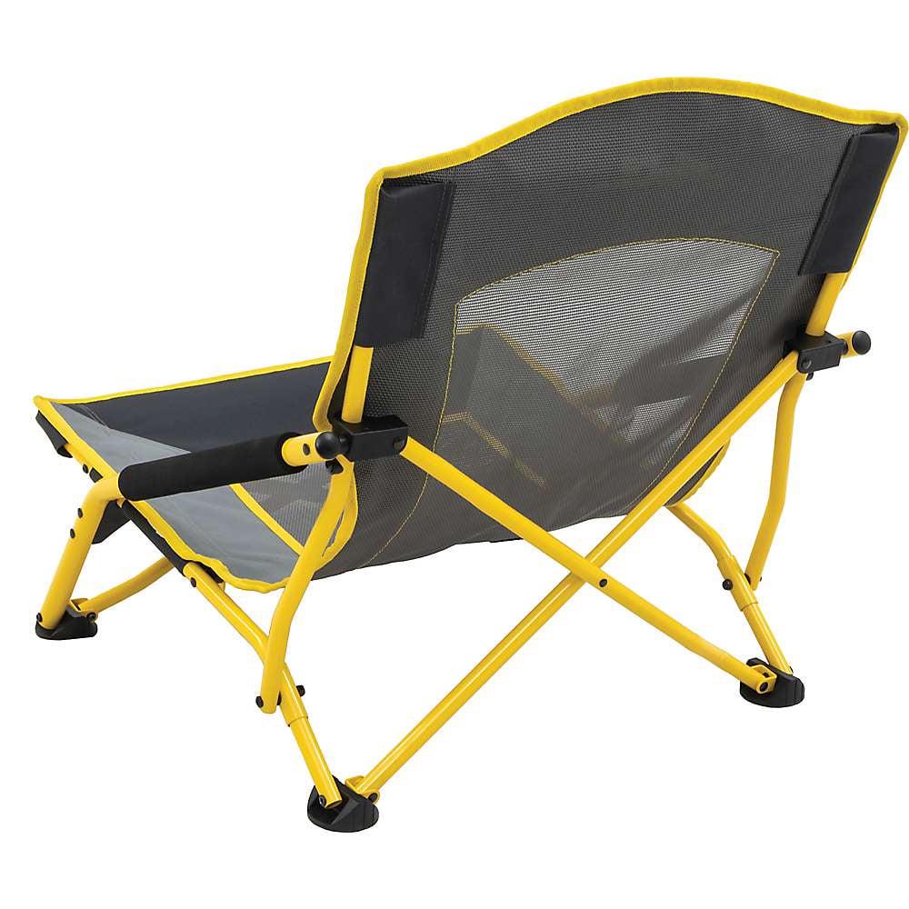 - Folding chair with arms sits low to the ground