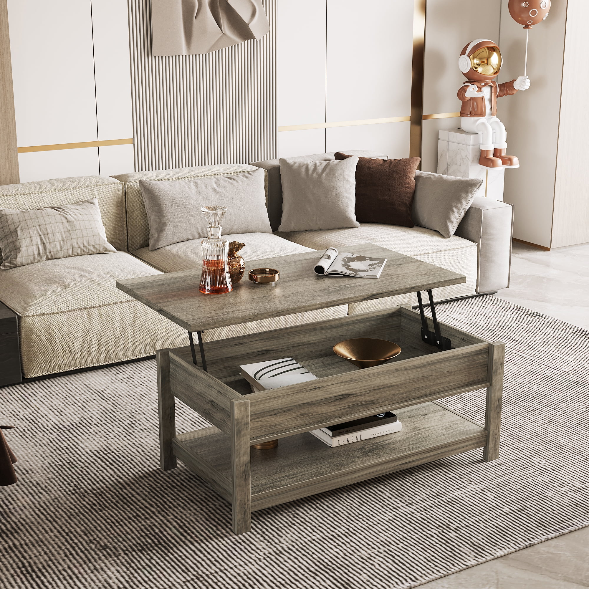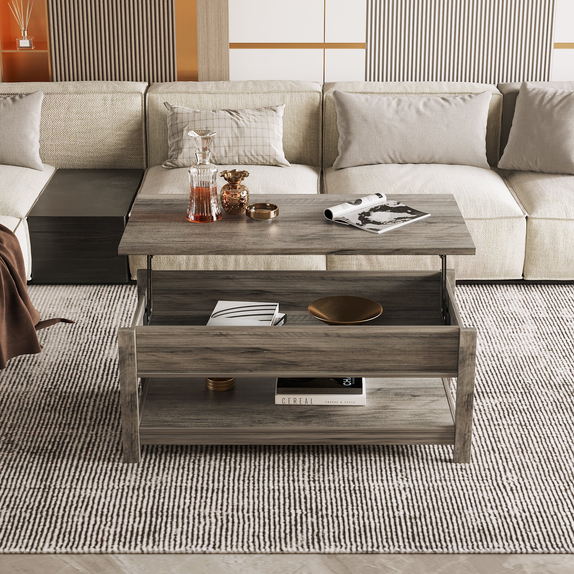 This 3 in 1 Multi-Function Coffee Table is the perfect addition to any living space. making it ideal for hosting guests or enjoying meals. The tabletop of this coffee table can be effortlessly elevated to a comfortable height to create a spacious workspace or dining surface while you’re sitting on the sofa. A hidden storage compartment beneath the top keeps your everyday items like laptop, remote controllers, game controllers handy and dirt-free. The spacious open shelf holds storage blankets, books, snacks and knick-knacks just fine.This practical table is definitely a worthwhile investment. lift top coffee table with solid construction and selected materials, this coffee table will not wobble once correctly assembled.The heavy-duty metal mechanism allows smooth and easy operation.Made with high-quality materials, this coffee table is designed to withstand regular use and provide long-lasting durability. The coffee table is easy to assemble, with detailed instructions included. You can have it up and ready to use in no time, adding convenience and practicality to your home.