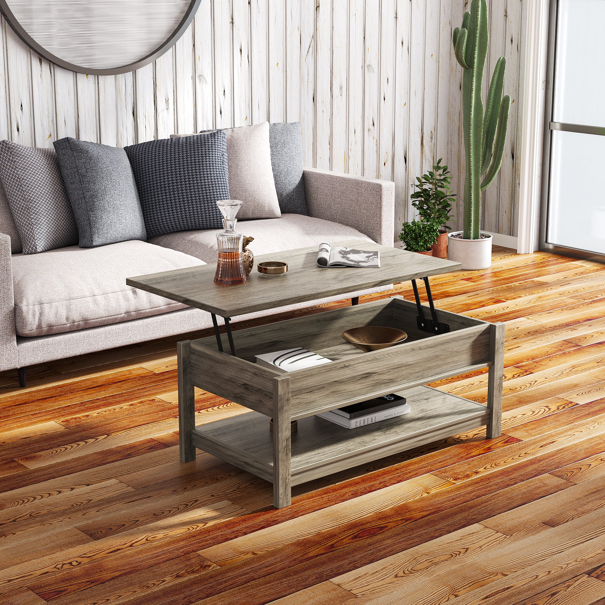ALPULON Modern Farmhouse Lift-Top Coffee Table, Gray Finish: Assembled Dimensions: 43.15″ L x 23.47″ W x 18.07″ H Top lifts up and forward to create a versatile work surface Hidden storage beneath top Open shelf for additional storage and display Finished on all sides for versatile placement Gray finish