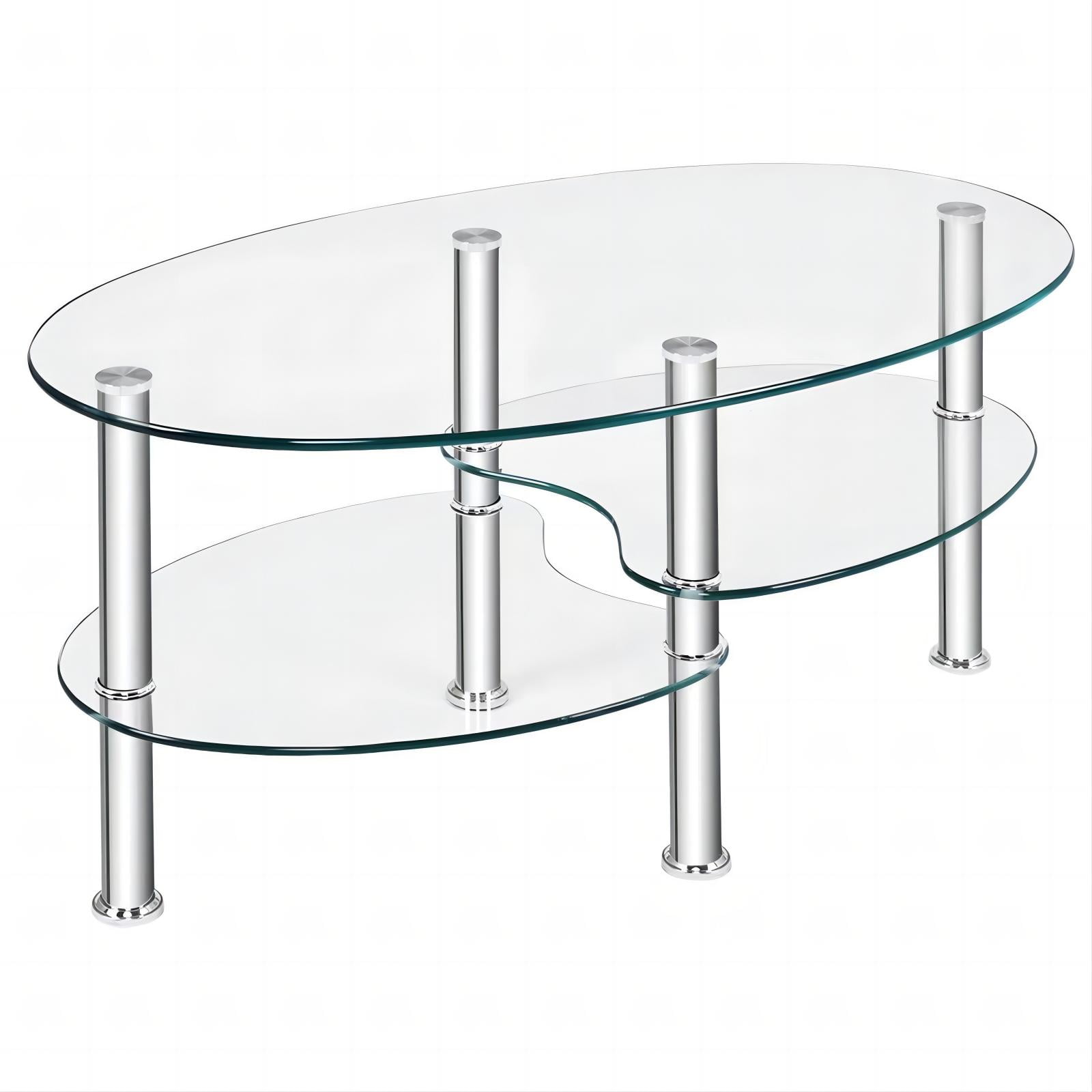 This is our elegant coffee table, which is ideal for morning coffee, leisure tea or afternoon tea. Made of tempered glass, this coffee table is strong and durable and Looks simple and stylish. The smooth and non-angular design of this table provides users more reliable and safe experience. It features 2 bottom shelves, providing more storage space for magazines, books, remote controls or other decorations. The clean and bright design combined with the harmonious proportions will create a calm and relaxing ambience, perfect to unwind your mind and body from a hard day at work. Do not hesitate to add it to your cart! Feature Strong and durable tempered glass, providing years of use Smooth and non-angular oval design for more reliable and safe use experience Features 2 bottom shelves, offering more storage space Clean, bright and elegant style Easy to clean and assemble Perfect for living room Assembly required Specification Material:Tempered Glass+ Metal Overall dimension:35.5”x 20” x18” (LxWxH) Dimension of the two bottom shelf:16.5”Lx 16”W Weight capacity of the top:90Lbs Weight capacity of the bottom shelf:45Lbs Package includes:1 x Coffee Table Strong and durable tempered glass, providing years of use Smooth and non-angular oval design for more reliable and safe use experience Features 2 bottom shelves, offering more storage space Clean, bright and elegant style Perfect for living room