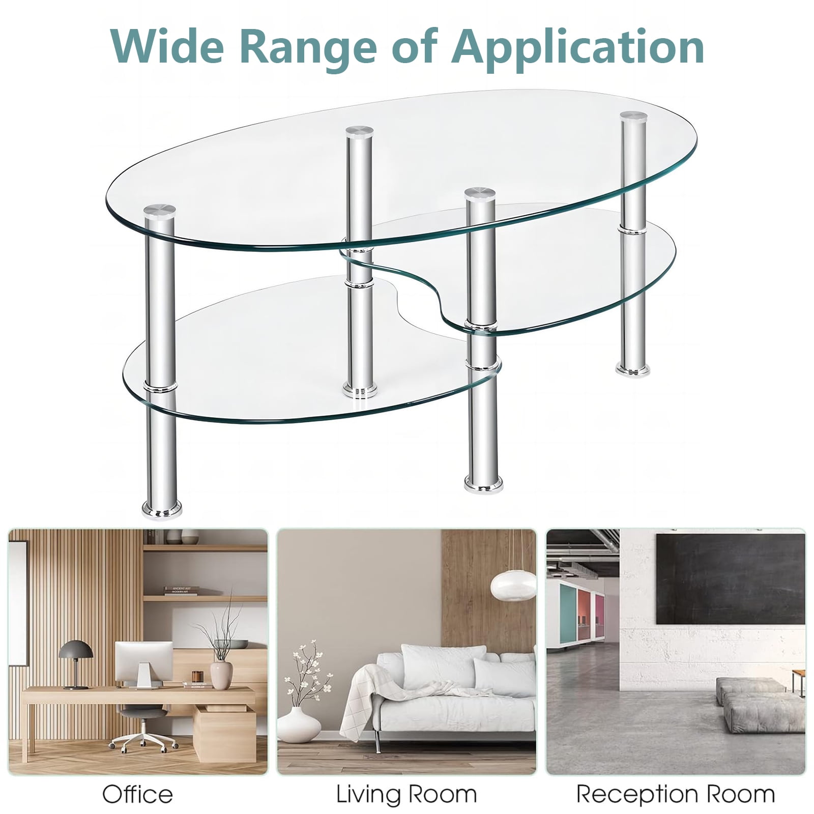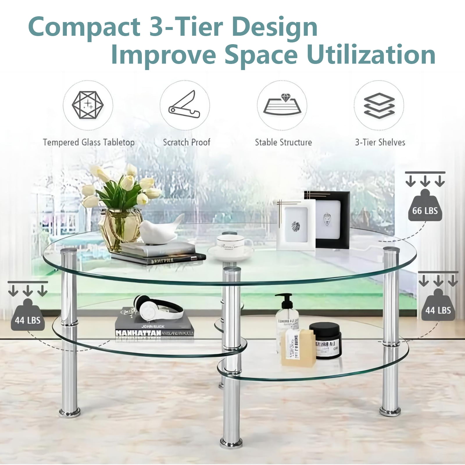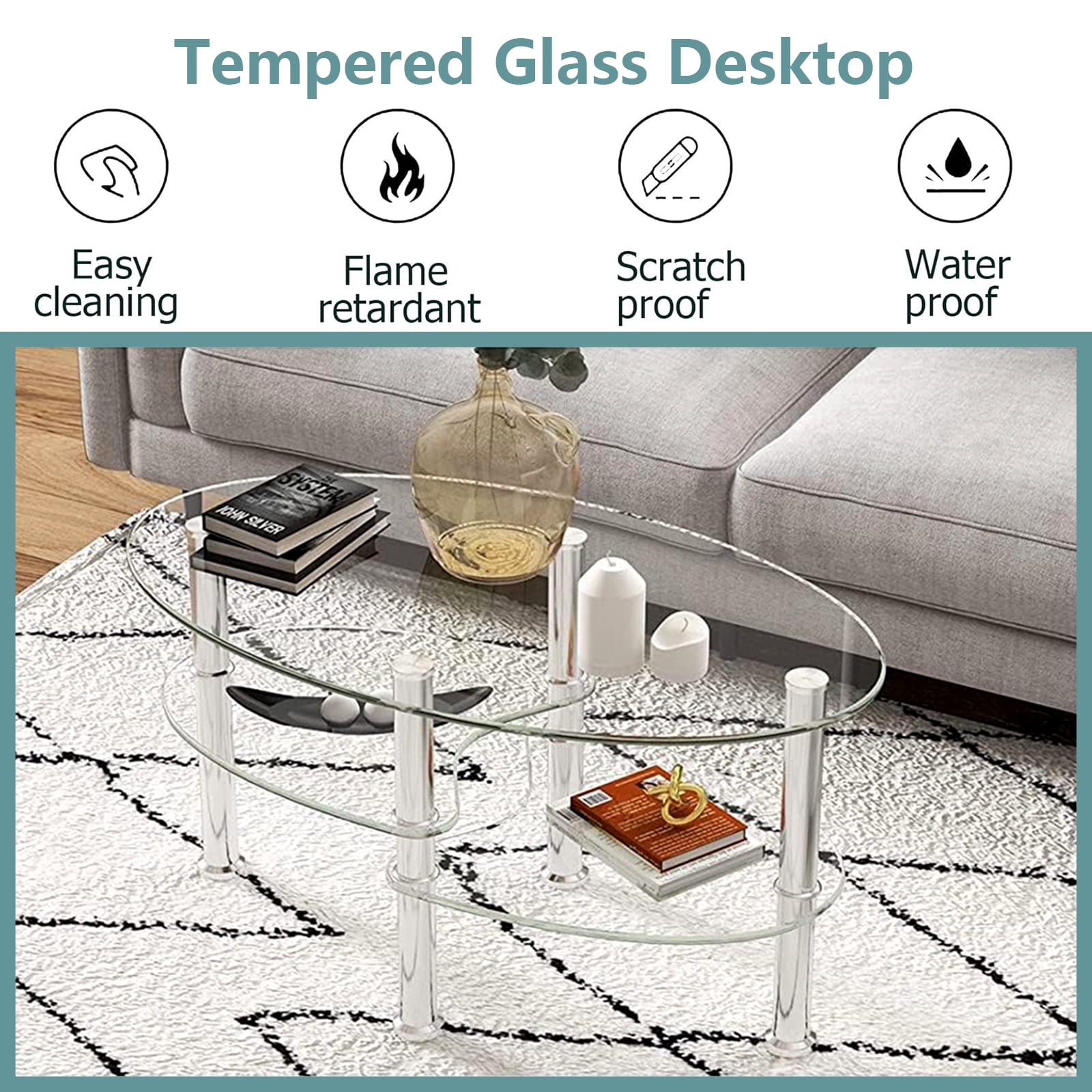 ALPULON Tempered Glass Coffee Table Oval 3-Tier Steel Tea Table for Home Living Room Office
