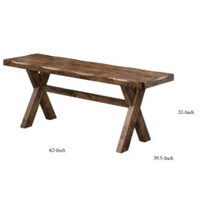 Wooden Trestle Style Base Bench, Brown- Saltoro Sherpi Bring a beautiful touch of rustic charm to your home. This Wooden Trestle Style Bench is sure to be the center of attention in any space you put it in. Crafted from wood, that boasts a Trestle base design, this bench delivers an organic feel. The edges of the bench are hand shaped for a worn look. Pair with your favorite dining table, or accent your entry way. This bench is built from knot wood, making this piece a lasting fixture in your home for years to come.