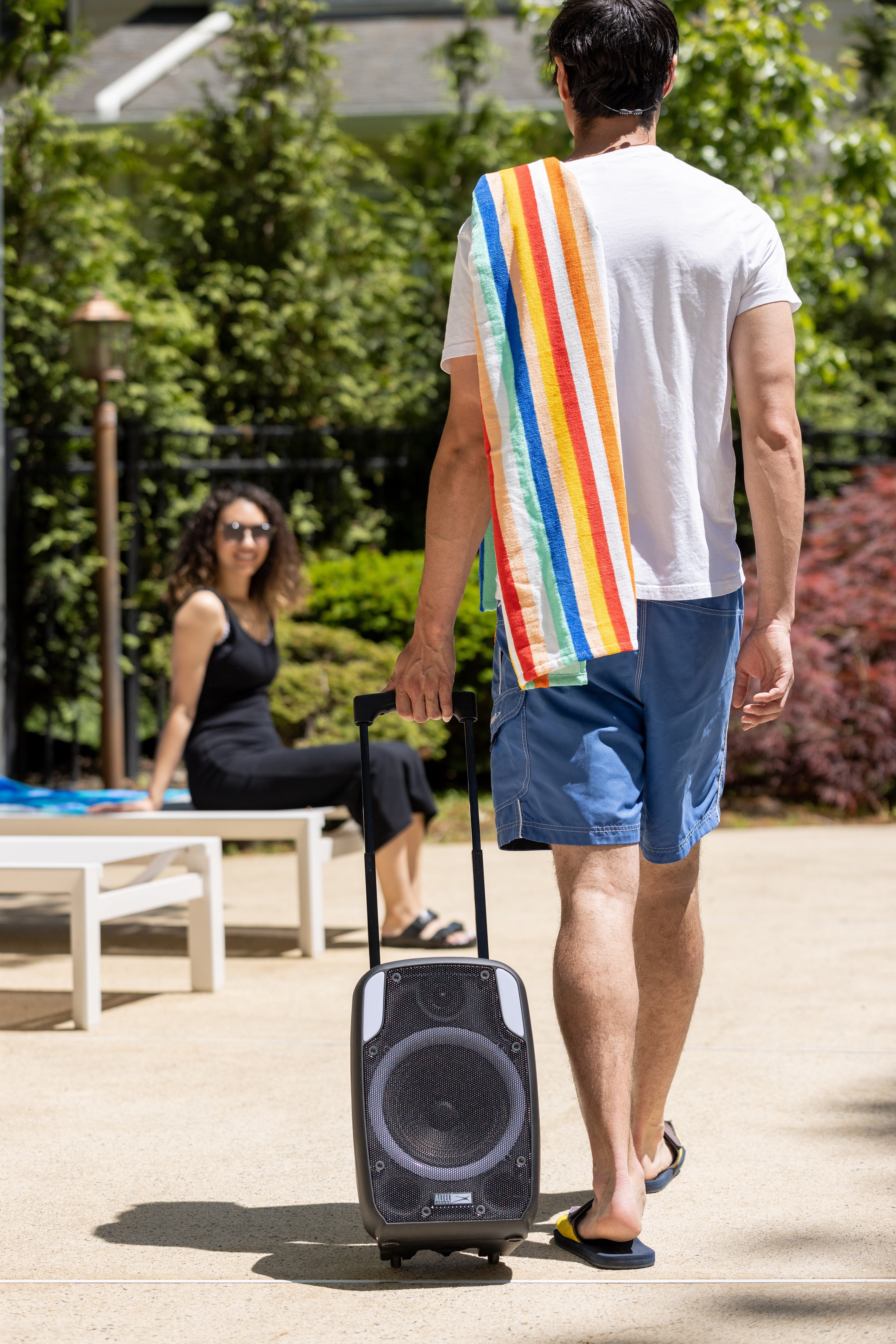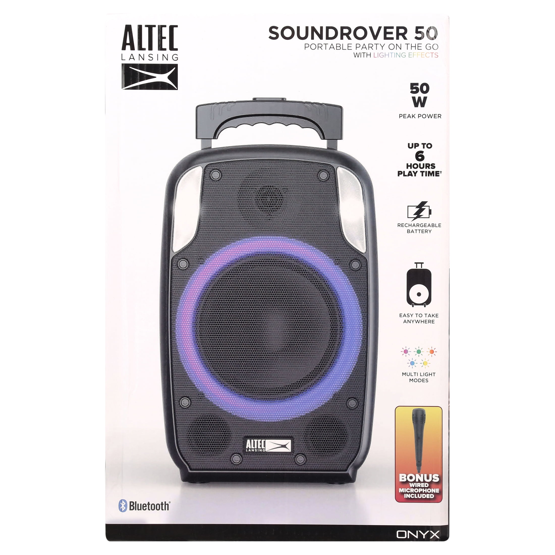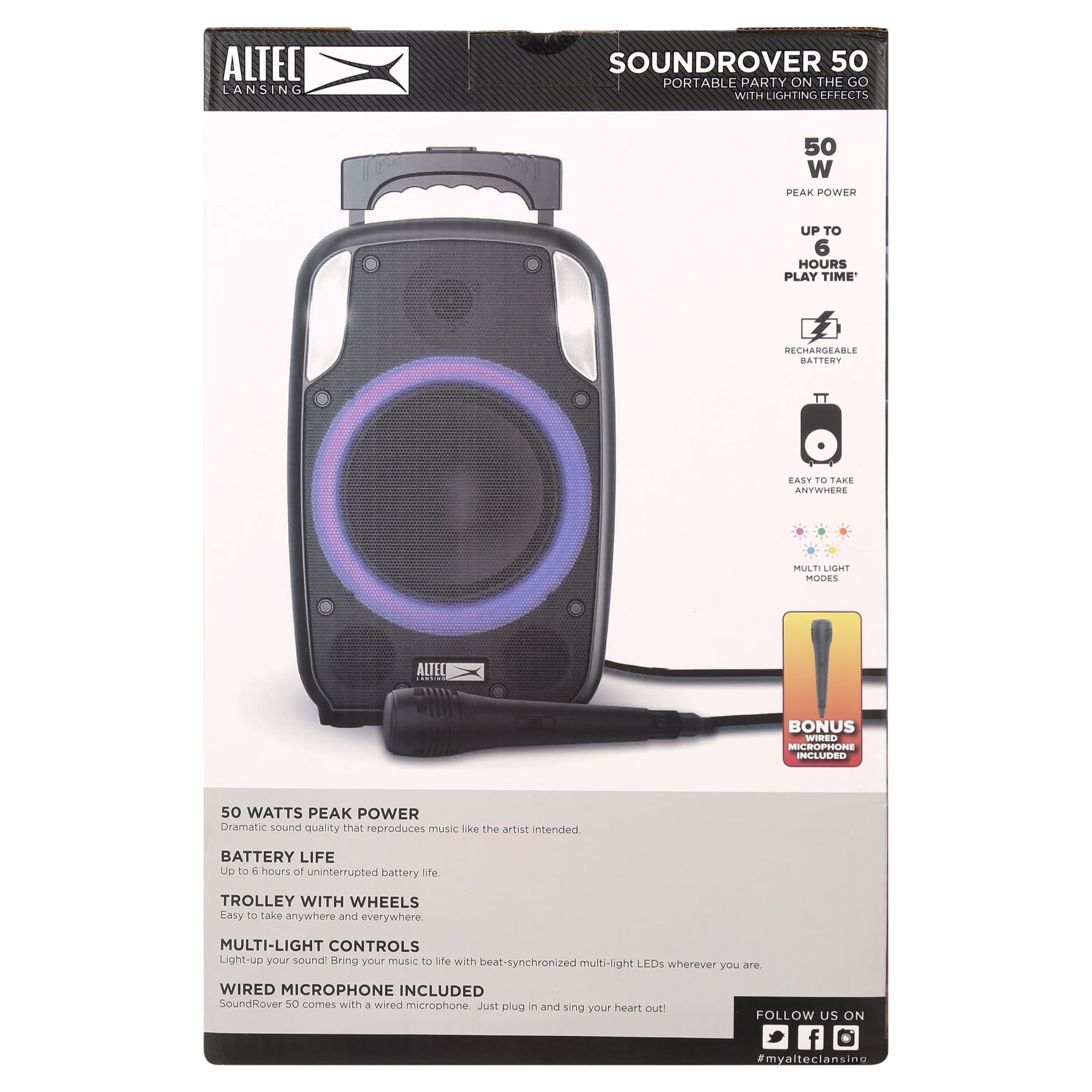 The Altec Lansing SoundRover 50 is a powerful portable party speaker with signature Altec Lansing sound and lighting effects. With its rechargeable 6-hour battery and 100-200 AC mains power cable input the music will outlast any party. Convenient carrying handles and wheels make it easy to transport your SoundRover 50 anywhere you go. Instantly create a party experience with the multi-party LED lights that pulse and strobe with the music and create an amazing party atmosphere. Plug in the included microphone and become the MC of your own party! Want to boost the volume even louder than 50W? Connect two SoundRover 50’s together via True Wireless Pairing.