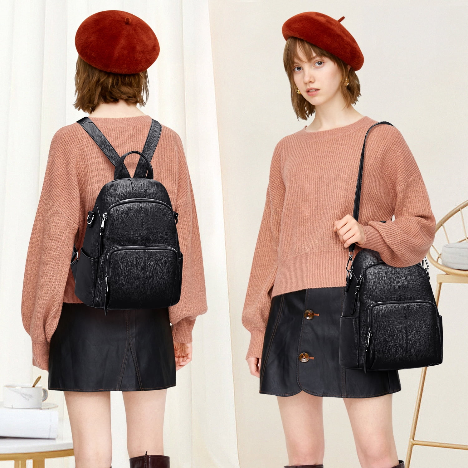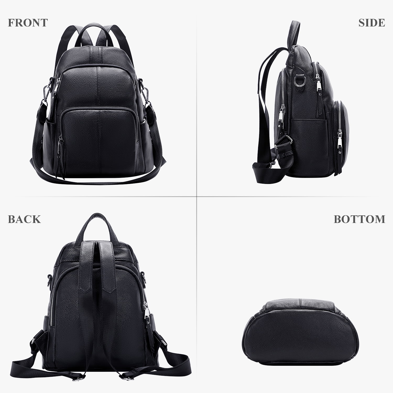 [HIGH QUALITY] — Made of top-grain cow leather (100% soft genuine leather), silver color hardware and polyester lining. [PRACTICAL ANTI-THEFT BACKPACK] — From outlook, this backpack looks like a normal backpack, but the main compartment is designed on the back sits up against the wearer’s body, keeping your belongings safe and secure. [CONVERTIBLE FEATURE] — This backpack comes with a 28-inch detachable shoulder strap, convert it into a shoulder handbag. [DIMENSIONS] — L 10.5 x W 4.5 x H 13 inch / L 26.7 x W 11.4 x H 33 cm, handle drop: 3 inch. Weight : 0.88 kg /1.94 lbs. (There may be a slight difference as our size measurement is based on the longest part of each side.) [LARGE CAPACITY WITH MULTI-POCKET] — 2 front zipper pockets, 2 open side pockets; 2 zipper pockets and 2 slip pockets in the main compartment. [GREAT GIFT] — Casual and fashionable in style, it is a perfect gift choice for your family, friends or yourself on Birthday, Anniversary, Valentine’s Day, Christmas, Graduation, and Special Day. [WARM TIPS] — Due to the light and screen setting difference, the item’s color may be slightly different from the pictures. The shoulder straps are a combination of leather and webbing for comfort and weight reduction.