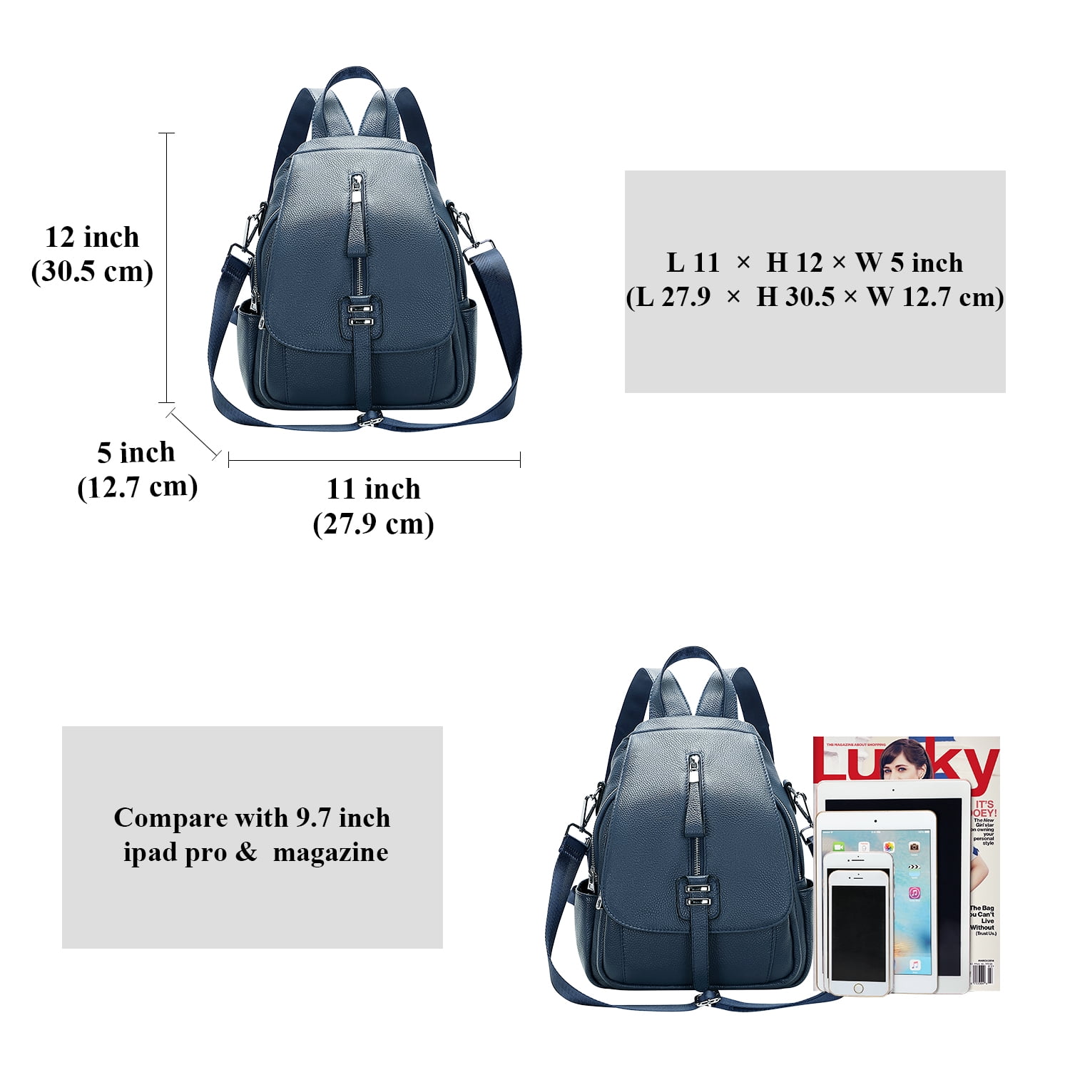 [HIGH QUALITY MATERIALS] — Made of top-grain cow leather (100% soft genuine leather), silver color hardware and polyester lining. [DIMENSIONS] — L 11 x W 5 x H 12 inch / L 27.9 x W 12.7 x H 30.5 cm, removable and adjustable shoulder strap length: 40 inch / 100 cm. Weight: 0.90 kg / 1.98 lbs. (The bag is shaped a bit like a trapezoid. And our size measurement is based on the longest part of each side.) [BACKPACK STRUCTURE & LARGE CAPACITY] — 1 flap zip pocket, 1 front snap pocket and zip pocket, 1 main zip compartment with 2 zip pockets and 2 slip pockets, 1 back zip pocket. [CONVERTIBLE CARRYING WAY] — This women leather backpack features a detachable and adjustable fabric shoulder strap and a top handle, you can convert it into a shoulder bag, cross-body bag or handbag. [GREAT GIFT] — Casual and fashionable in style, it is a perfect gift choice for your family, friends or yourself on Birthday, Anniversary, Valentine’s Day, Christmas, Graduation, and Special Day. [WARM TIPS] — Due to the light and screen setting difference, the item’s color may be slightly different from the pictures. The backpack straps are a combination of leather and webbing for comfort and weight reduction.