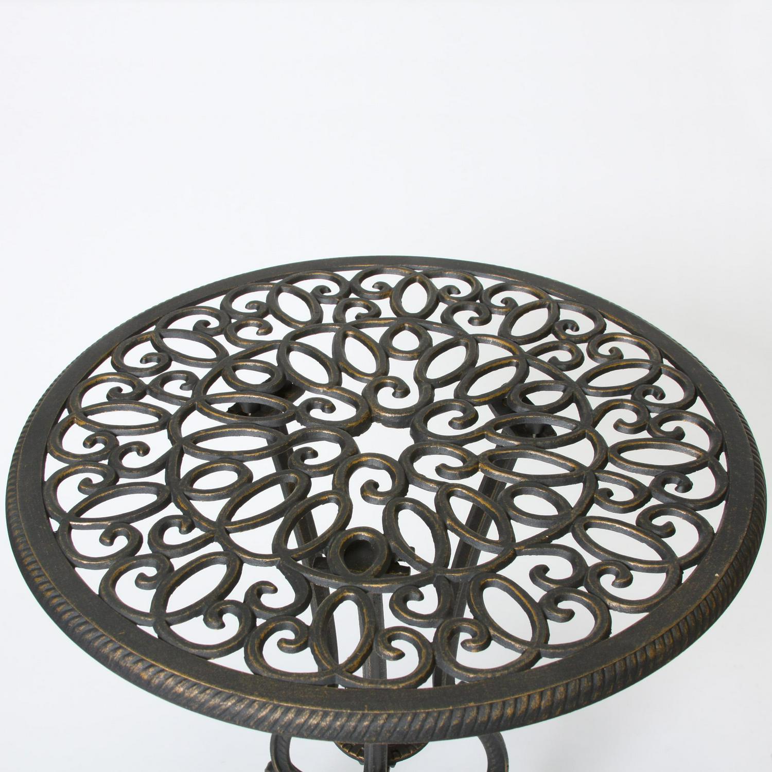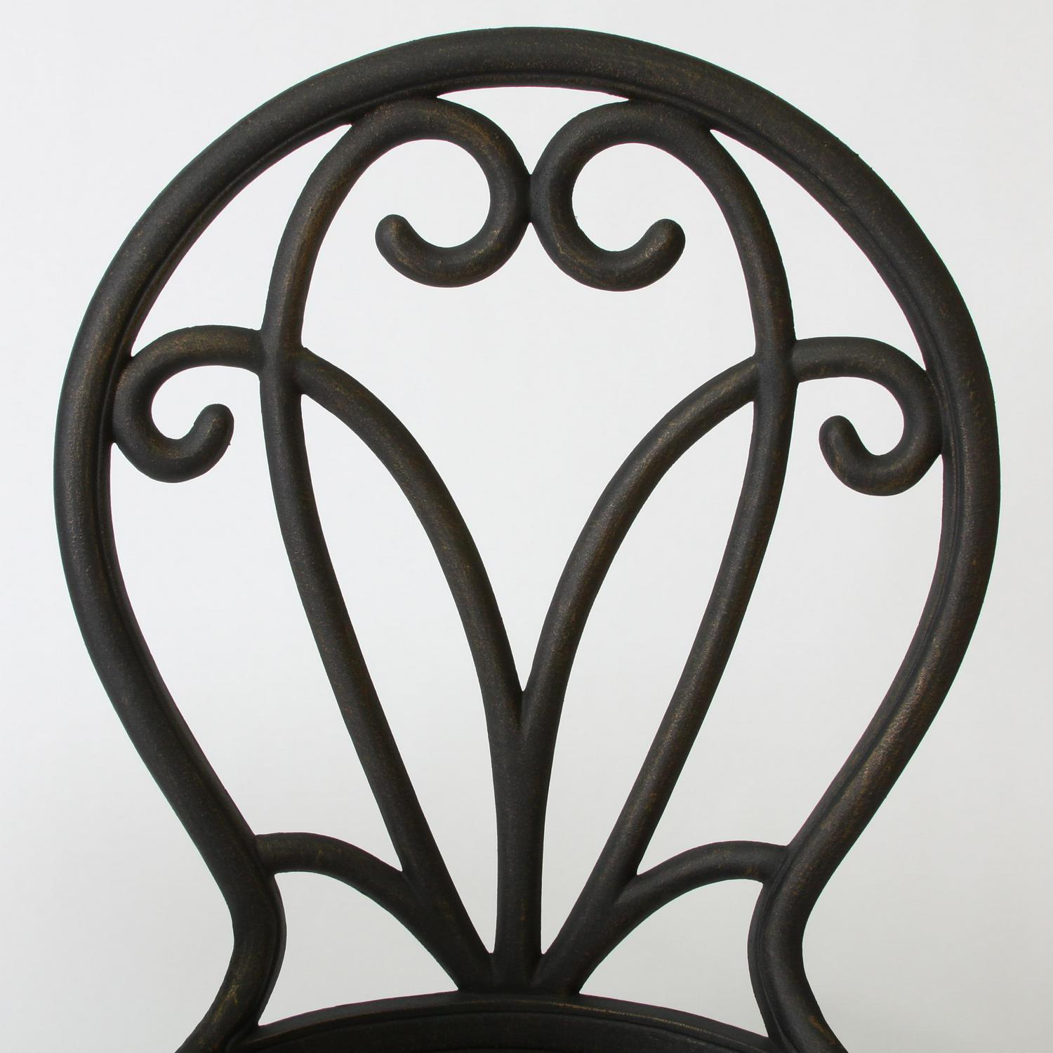 TRADITIONAL: With an elaborate floral design and beautiful lattice pattern, our three-piece bistro set brings a regal style to any outdoor space. The dark, antique color emphasizes the traditional elements of the piece, giving your home a sophisticated and ornate atmosphere.