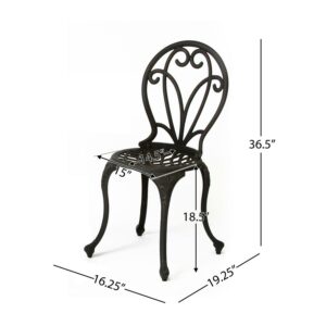 Surround yourself in regal aesthetics by gifting your outdoor space a stunning bistro set. Perfect for your backyard or patio, our three-piece set gives you a place to sit outside and enjoy your favorite book with a cup of tea. Our set features a stunning floral design, lattice-patterned seating, elegant cabriole legs, and is completed with a matching circular table. Crafted from cast metal, this lovely set not only brings your space an upgraded look but is also made to last.