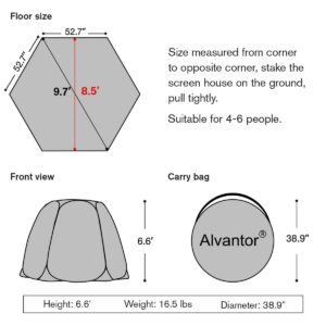 DESIGN PATENT Pending Lightest Pop Up Screen Room for 4-6 adults is only 15 lbs, 1/3 weight of similar items, innovated frame and folding way keep compact carry bag with 39.3″ diameter. This clam screen tent is light weight, pop up automatic, no assembly need, stable and durable, easy folding and carry around. Alvantor canopy tent frame is made of fiberglass, light-weight and long-last, other similar mesh tents on the market are made of steel and iron, which is heavy and easy to be rusted.