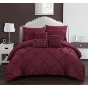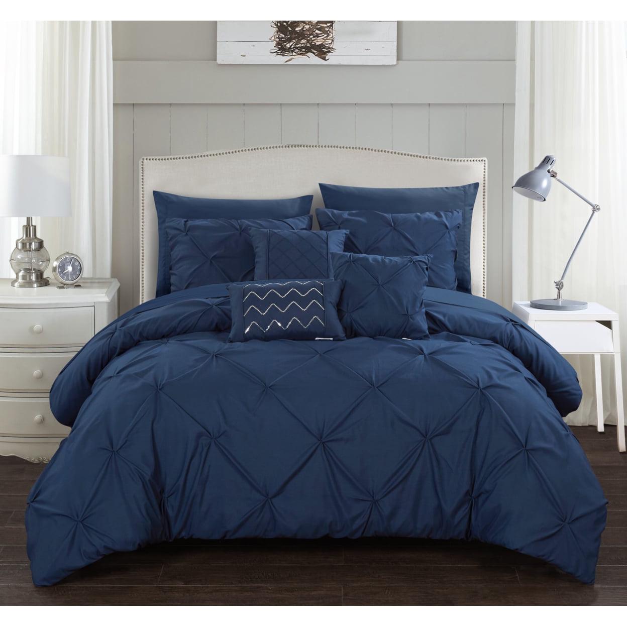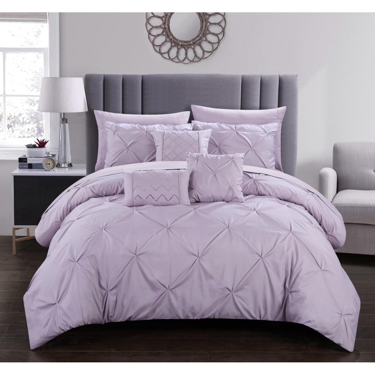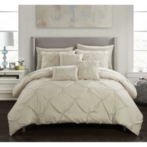 A fashion forward bed in a bag comforter set with everything you need for a complete bedroom dandeacute;cor makeover. Elegant and sophisticated pinch pleat pin tuck design with ruffled details. Super-soft microfiber sheets, design coordinated shams and deco pillows are included to complete the look.