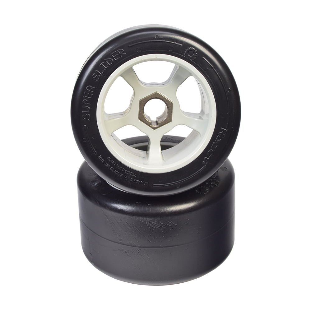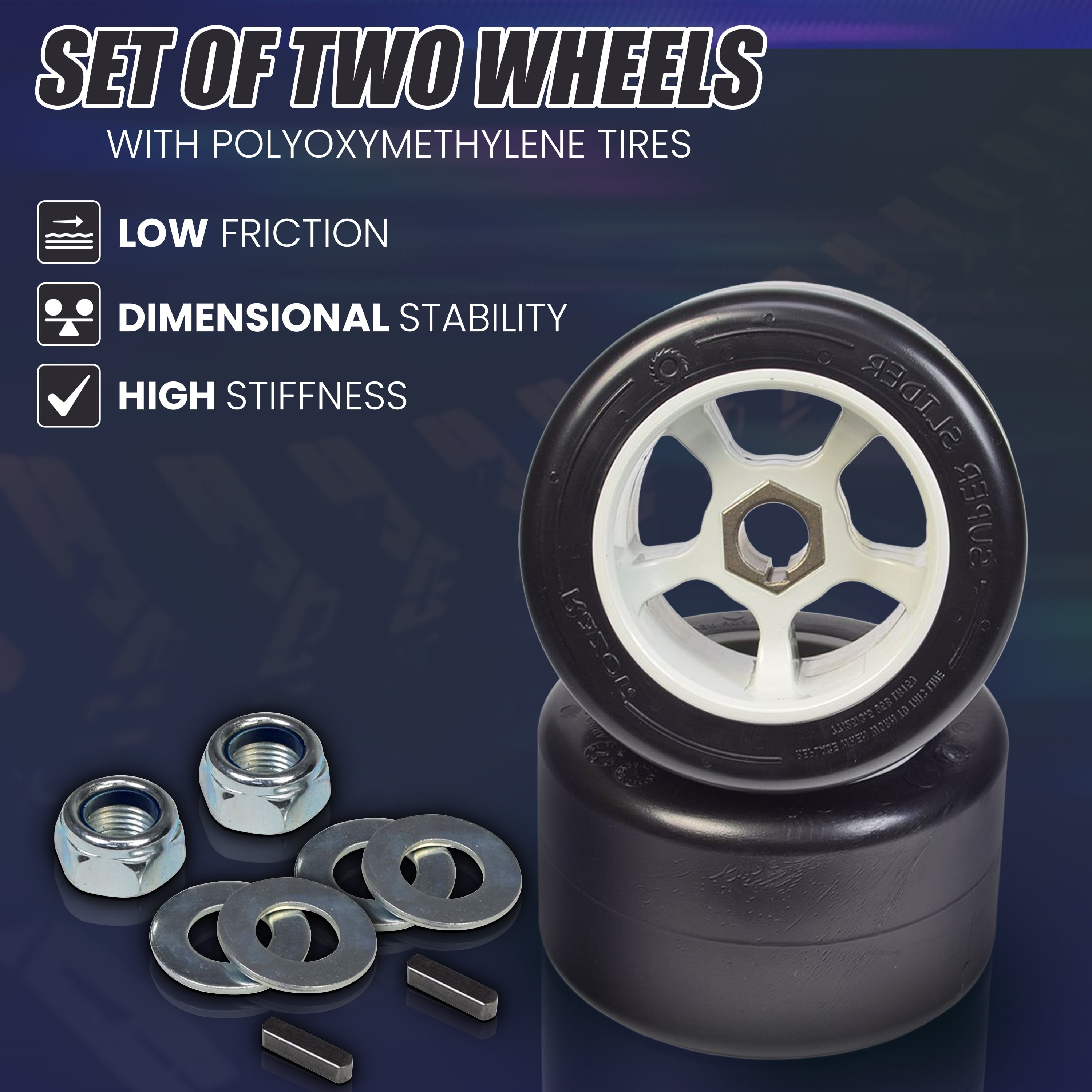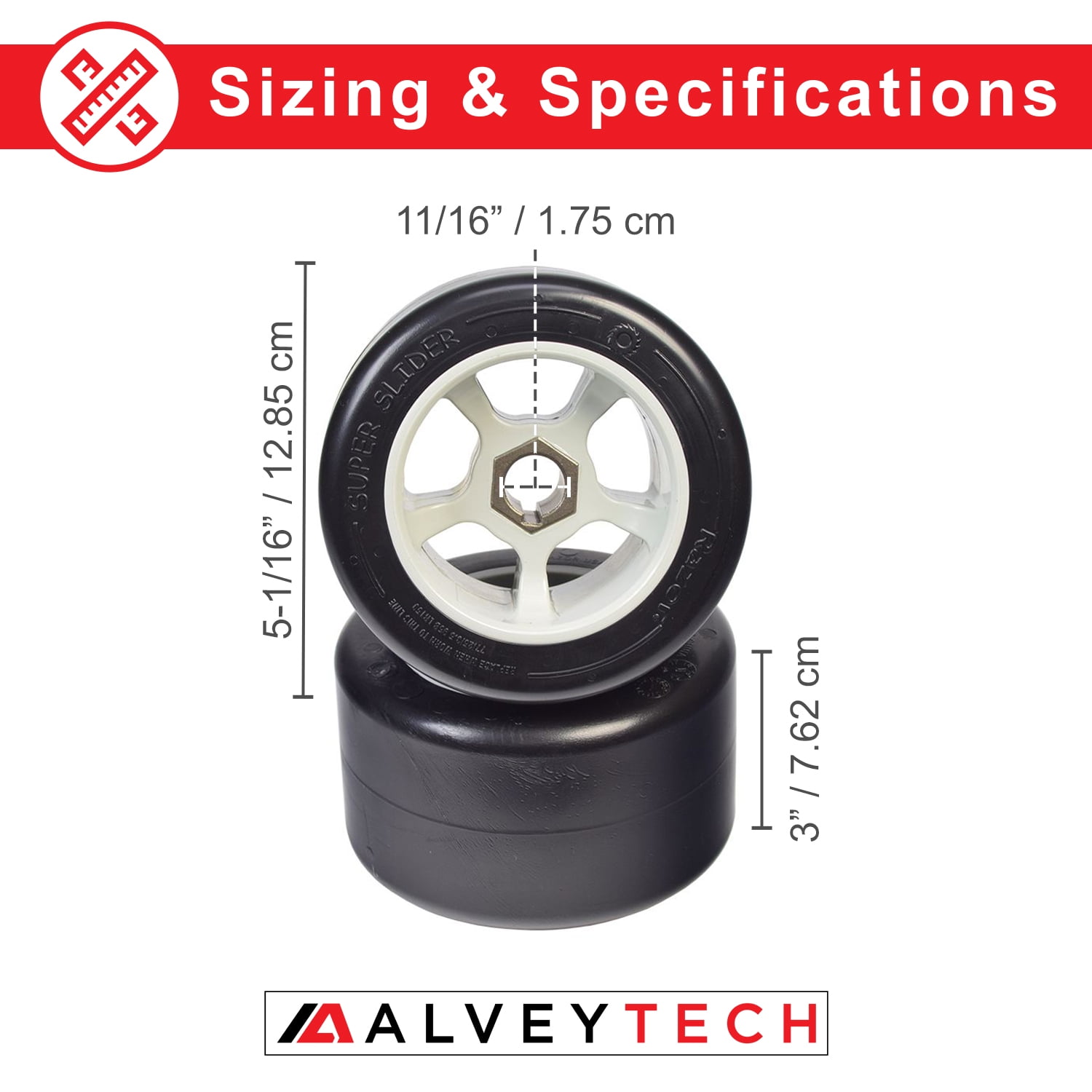 Are you looking for a set of replacement rear wheels that will help you slide around in your go-kart like a pro? Look no further than the AlveyTech Super Slider POM rear drift tires! Parts and accessories like this are no longer hard to find! Polyoxymethylene (commonly referred to as POM and also known as polyacetal or polyformaldehyde) is an engineering thermoplastic used in precision parts that require high stiffness, low friction, and excellent dimensional stability. Each wheel is equipped with a low friction POM tire. These low friction tires are compatible with the Razor Ground Force Drifter and Ground Force Drifter Fury, and will make it easy for you to pull off the power slides, bat turns, 180s, and fish tail slides that electric drift go-karts are known for. So get ready to step up your drifting game with the AlveyTech Super Slider POM rear drift tires! Add a set of these wheels, or perhaps even a second set, to your cart today! – MODEL COMPATIBILITY Razor: Ground Force Drifter; Ground Force Drifter Fury. – SPECIFICATIONS Diameter: 5-1/16” (12.85 cm) Width: 3” (7.62 cm) Center hole: 11/16” (1.75 cm)