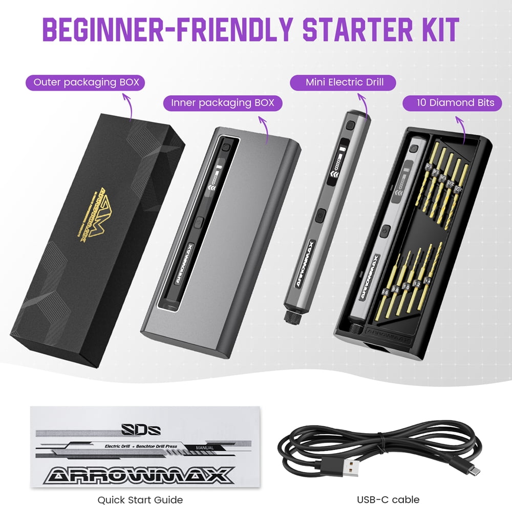 Unleash your creativity with the compact and versatile AM ARROWMAX Mini Electric Drill. Featuring an adjustable 4-speed motor up to 700RPM, this cordless rotary tool delivers precise and efficient drilling on a variety of materials, including wood, aluminum, plastic, and even circuit boards. Equipped with a high-capacity 500mAh battery and a set of 10 drill bits, the SDS Ultra Mini Drill Kit is the perfect companion for all your DIY projects, crafting needs, and on-the-go tasks.