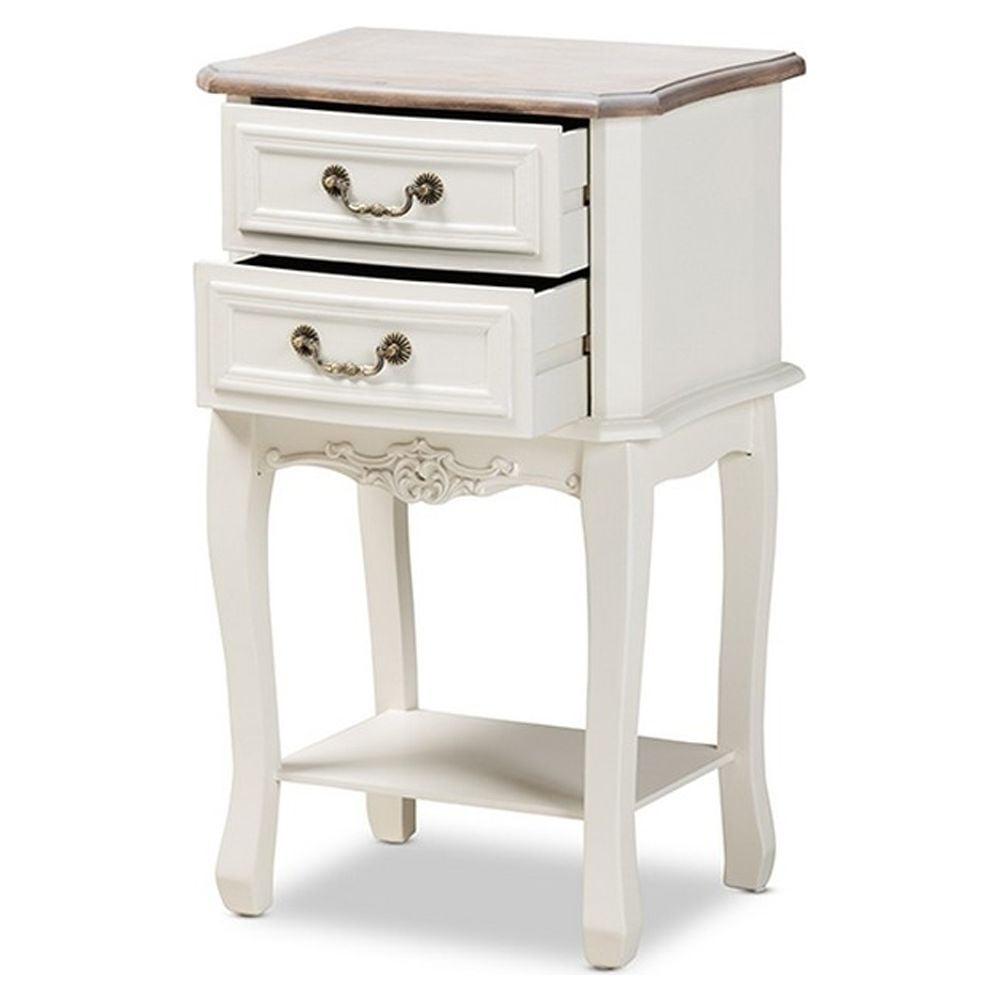 Amalie Antique French Country Cottage Two-Tone White and Oak Finished 2-Drawer Wood Nightstand Enhance your bedroom with the charming Amalie nightstand. Constructed from wood, this nightstand pairs a white-washed oak tabletop with polished white drawers. The tabletop features space to place a lamp, while two drawers offer storage space for bedside knick-knacks. Each drawer is adorned with molding detailing and an elegant brass metal handle. Additional storage space is provided by an open shelf on the bottom. Inspired by French provincial furniture, the Amalie displays exquisite cabriole legs. The Amalie nightstand is made in China and will arrive fully assembled.