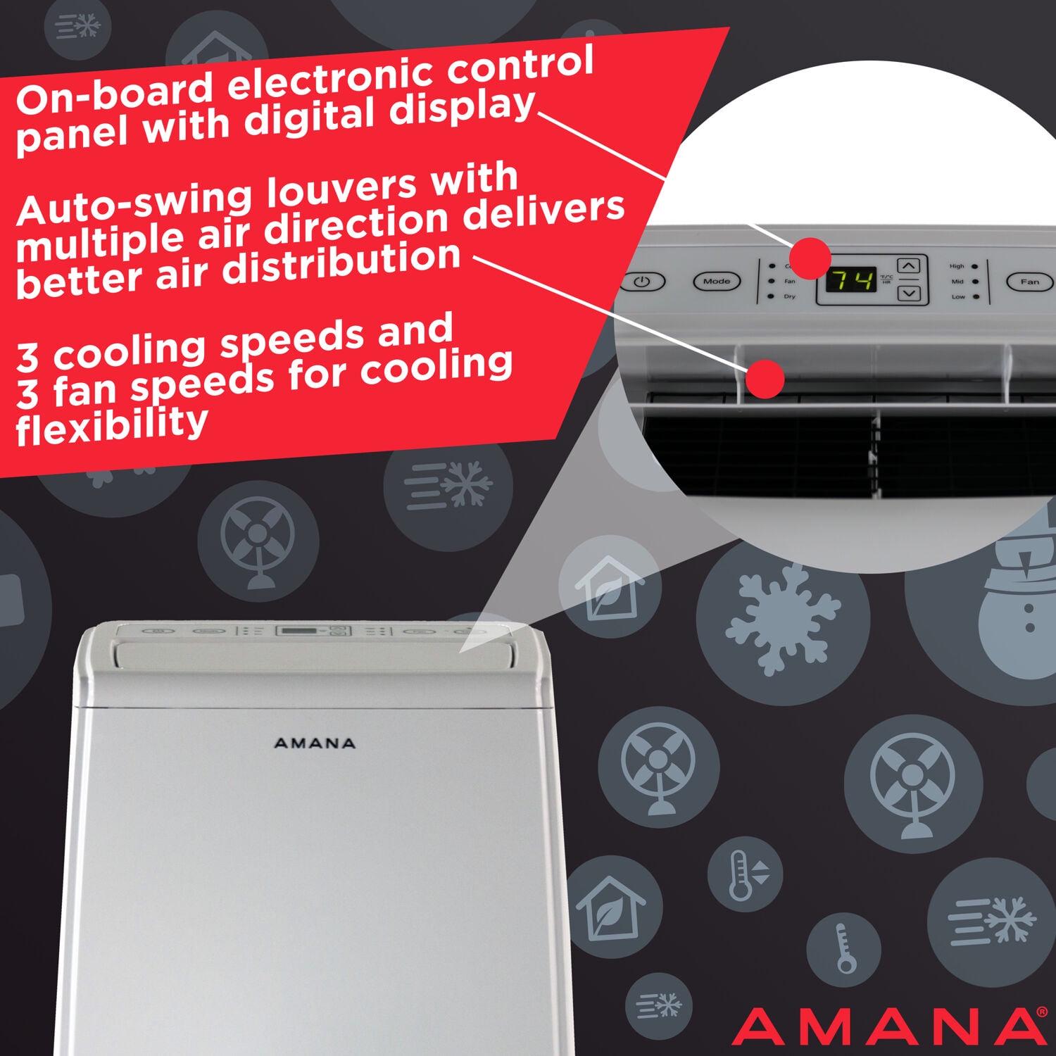 – This Amana portable air conditioner s control panel features large, easy to read, and easy to press buttons that help make operation effortless. The on-board controls are backed up by a simple to use remote control with words instead of icons. Auto-swing top louvers help deliver better air distribution. Your unit cools what you want, when you want, and how you want.