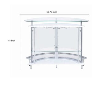 Contemporary Bar Unit with Clear Acrylic Front , White- Saltoro Sherpi Minimalistic contemporary style makes this bar unit a serving piece and display piece in one. The sleek design features a durable metal frame, a Demilune shape tempered glass top and clear acrylic front. The white finish base shelf and secondary shelf below the glass top completes the look of this bar unit. The middle of the unit includes a Demilune shelf and stemware storage.