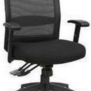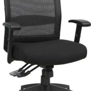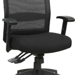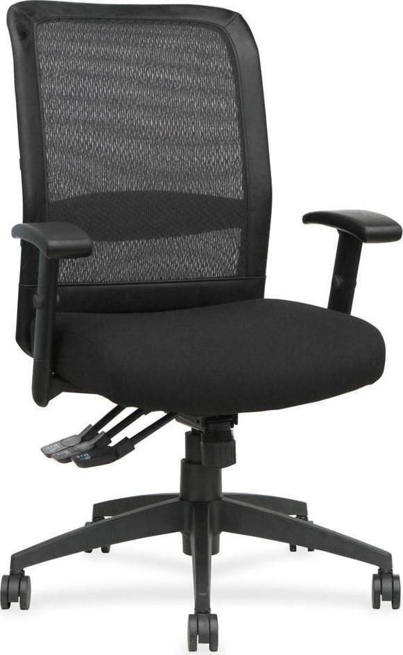 High-back chair offers a flexible mesh back for breathable comfort, adjustable lumbar support, cushioned fabric seat and a steel frame back for strength. Arms with polyurethane padding adjust in height so you can find just the right arm position. Chair offers many functions so you can adjust it for more efficient seating. Seat and back angle adjust with a single lever. Other functions include pneumatic seat-height adjustability, 360-degree swivel, infinite locking within a fixed range and tilt tension. Five-star nylon base is equipped with five casters for easy chair movement.