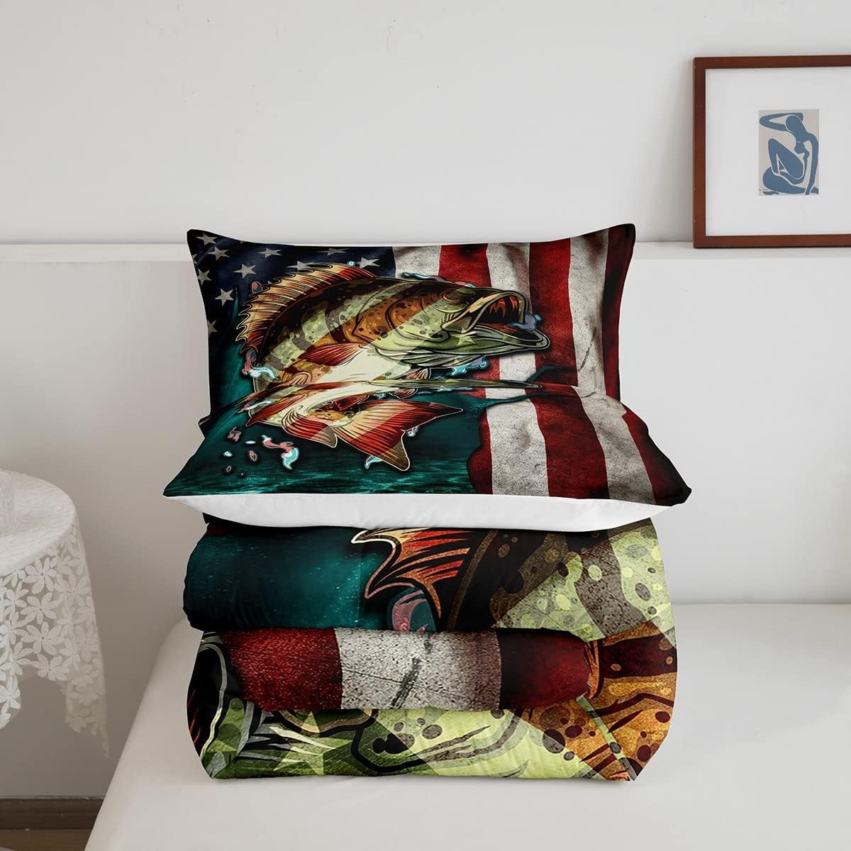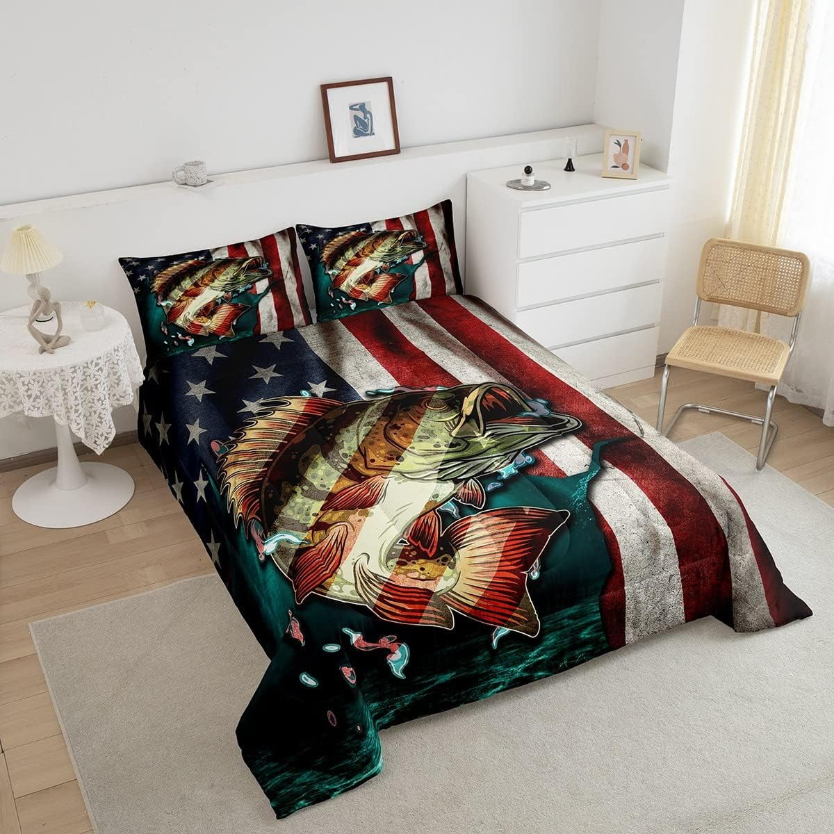 American Flag Bass FishingTwin Bedding Set Fisherman Fishing Comforter USA Flag Duvet Insert Big Pike Fish Fishing Lures Hook Hunting Decor Quilt Hunting and Fishing Farmhouse Decor