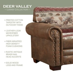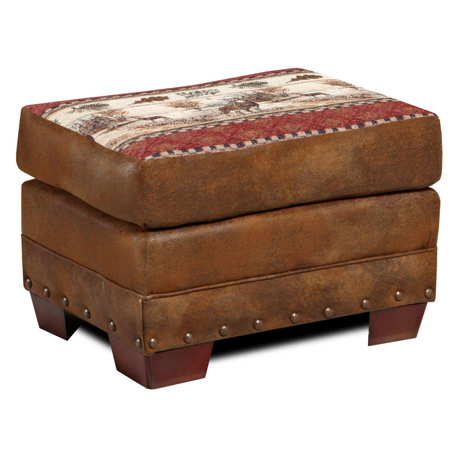 Beautiful tapestry coupled with leather-look microfiber fabric makes this ottoman come alive with the colors of nature. Solid wood frames create a product that will last for years, and solid wood legs and nailhead accents bring a rustic look to this ottoman. Soft but supportive cushions are filled with high density foam and a layer of fiber wrap. This is a perfect ottoman for your den or living room.