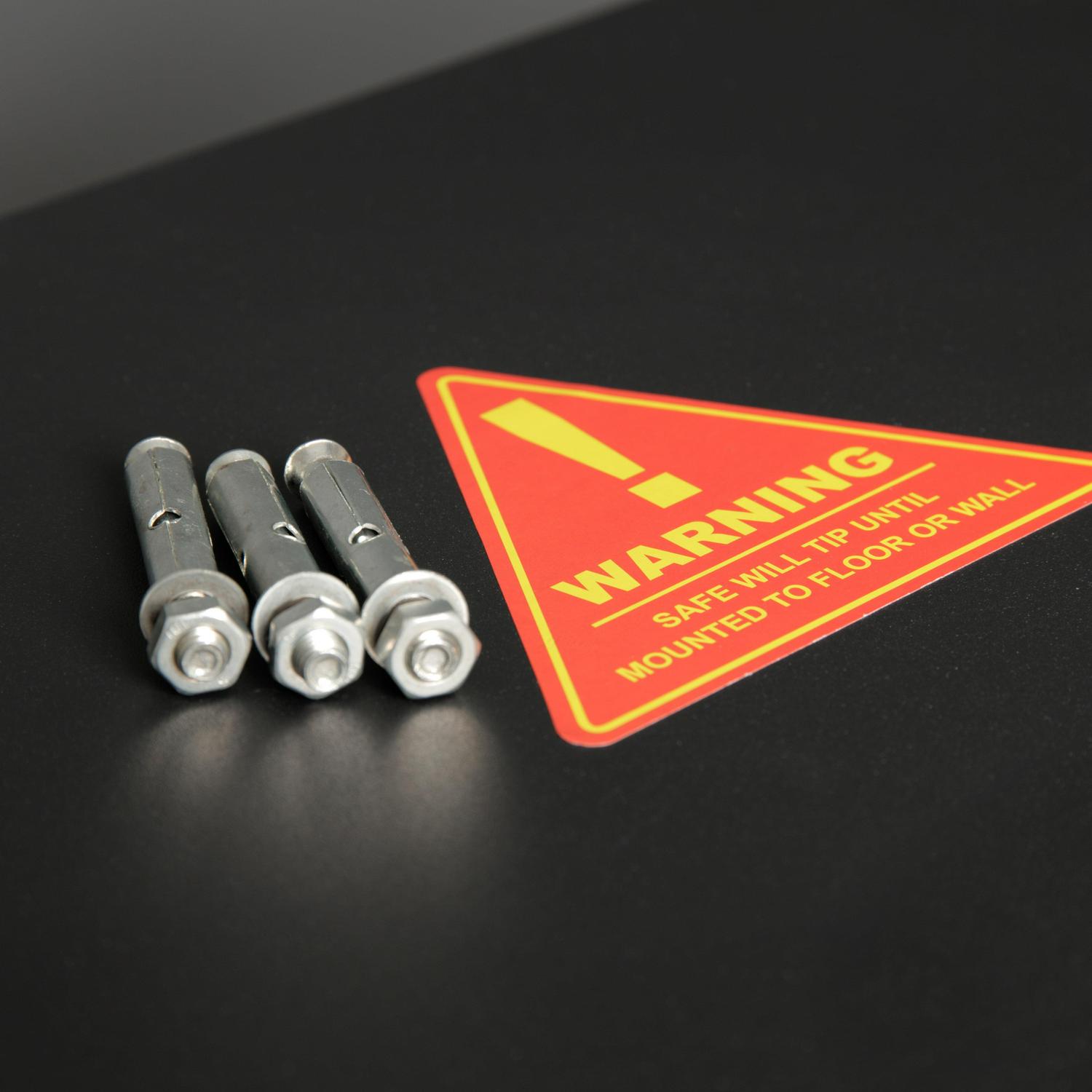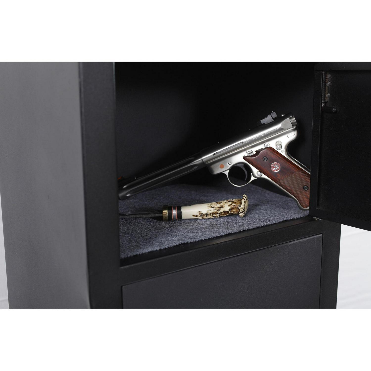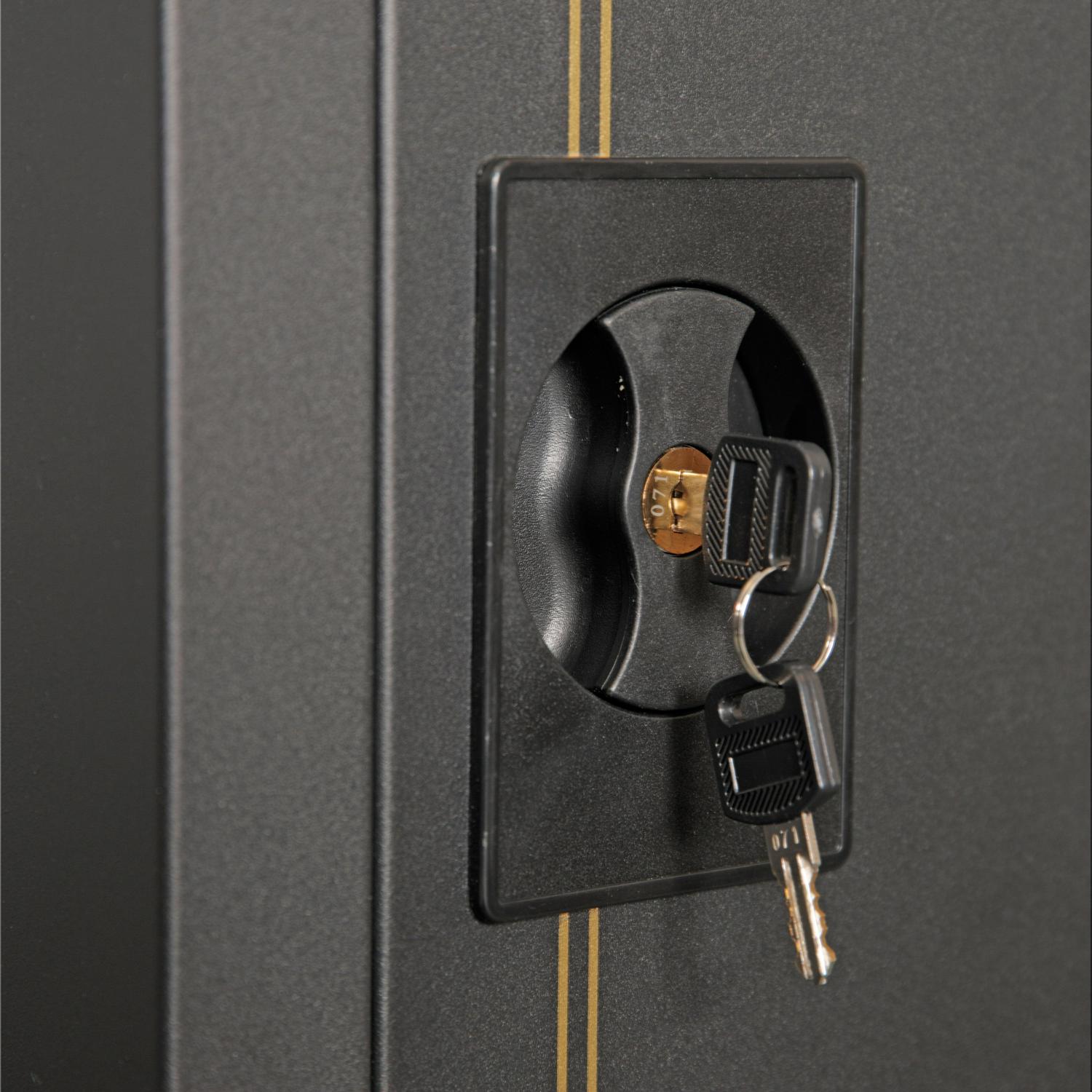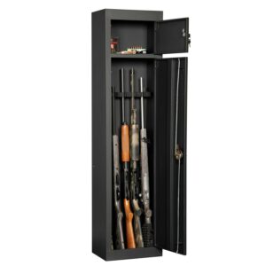 Protect your firearms with the American Furniture Classics 5 Rifle Metal Home Gun Safe Storage Cabinet. This home gun safe protects all your weaponry and valuables from invaders, moisture, and dust. It’s equipped with 2 separate spaces to store up to 5 long rifles, pistols, and ammunition. The state-of-the-art 3-point locking system keeps your guns in and intruders out with its new ground breaking algorithm. This black gun storage cabinet is constructed out of heavy-duty metal material to ensure durability and security. It’s fully assembled when delivered to make set up easy and has a 59-inch length, 14.5-width, and 10-inch depth. Keep your right protected with the American Furniture Classics 5 Rifle Metal Home Gun Safe Storage Cabinet. Model 906 features two key locking compartments.