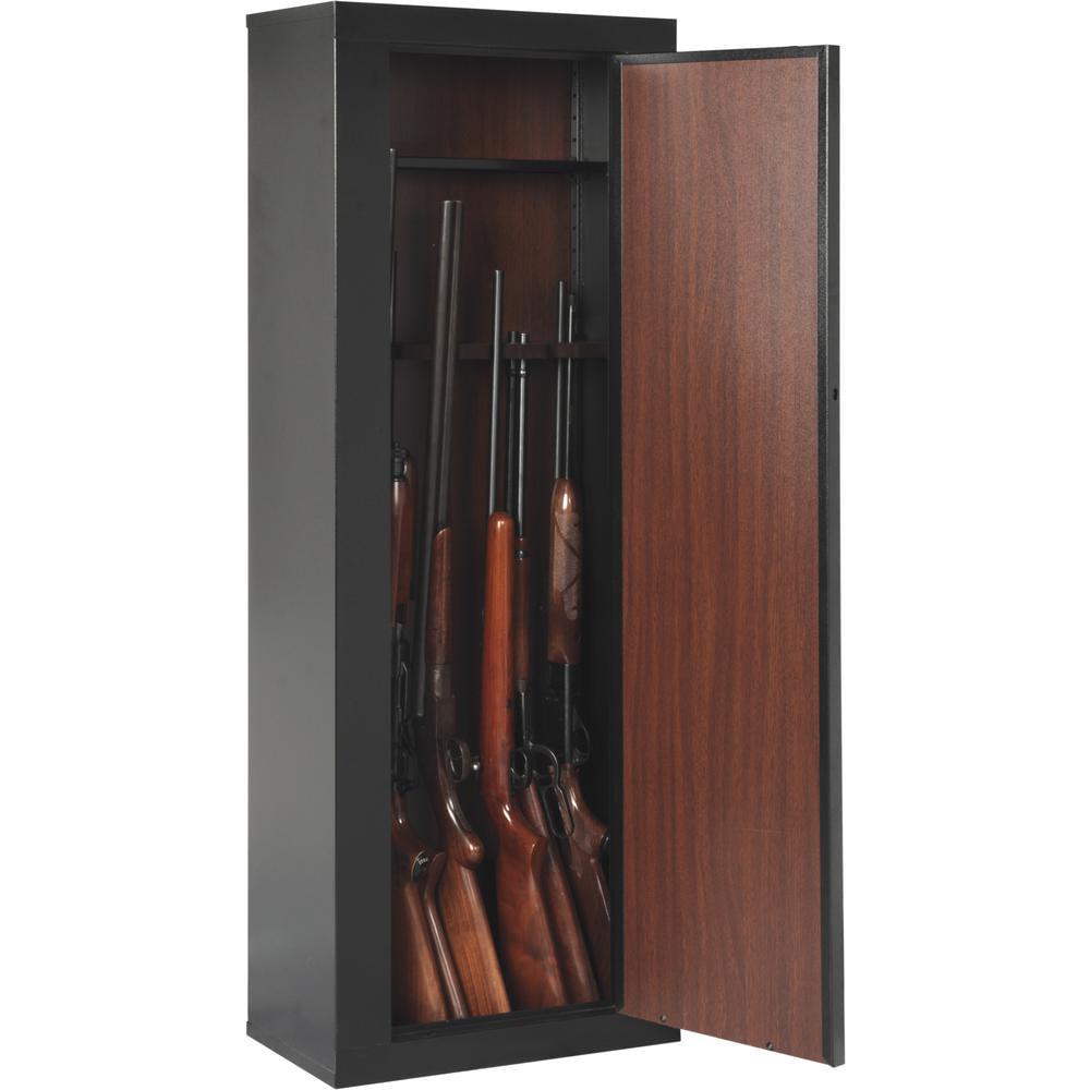 Stylish and spacious, the American Furniture Classics gun cabinet is an extremely elegant and safe way to store your guns. The wordmark series 10-gun cabinet with its three-bolt locking mechanism ensures that your guns are inaccessible to anybody without a key. While safety has been given top priority, the beauty of this cabinet will add a touch of class to any room. The gun cabinet interior, as well as the back of the door, sports a wood paneling accent. The metal gun cabinet has also been given a special finish that makes it completely scratch-resistant. The polished brass finish of the door handle and the key slot gives the cabinet an added charm – and all this is at a price that is extremely competitive. Model 910 designed to store rifles and shotguns.